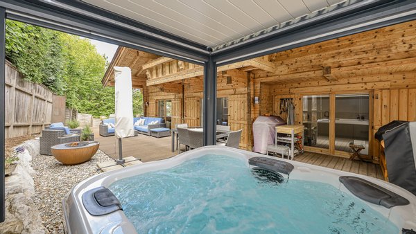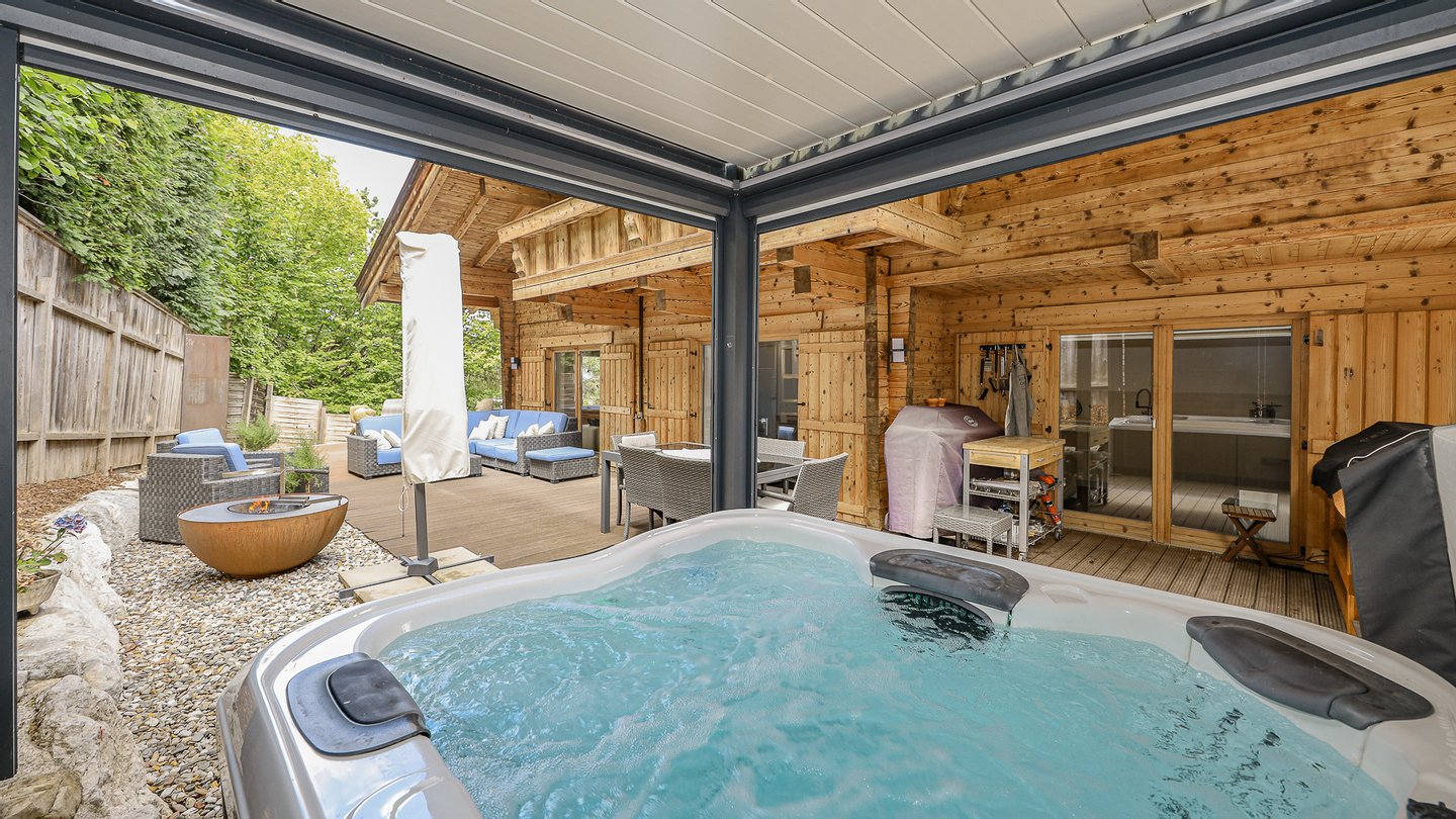 Hier wurde eine kleine Wohlfühloase geschaffen. Zahlreiche Sitzmöglichkeiten, eine Outdoorküche, ein Gartenhaus, wo man auch eine Sauna installieren könnte, sowie ein großer Whirlpool von Villeroy & Boch stehen hier zur Verfügung.