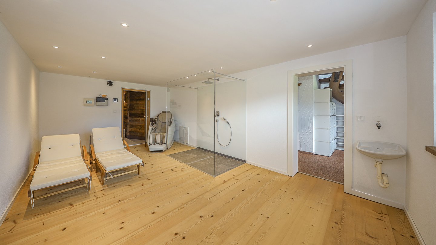 Weiters sind auf dieser Ebene der großzügige Wellnessbereich mit Dusche und Sauna, ein Gästeapartment mit Kochzeile, Sitzecke, Schlafgelegenheit und Badezimmer sowie Nebenräume wie der Hauswirtschaftsraum, der Technikraum, sowie zwei Abstellräume vorhanden.