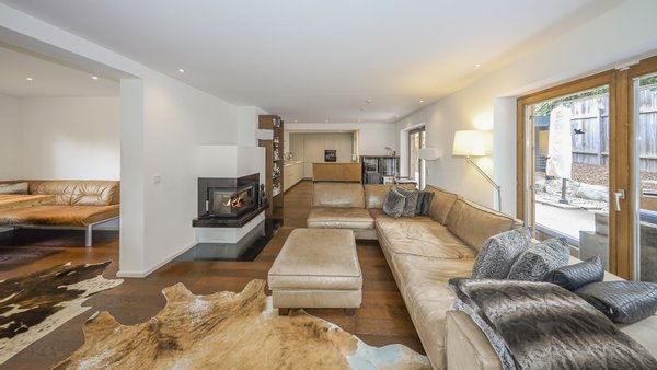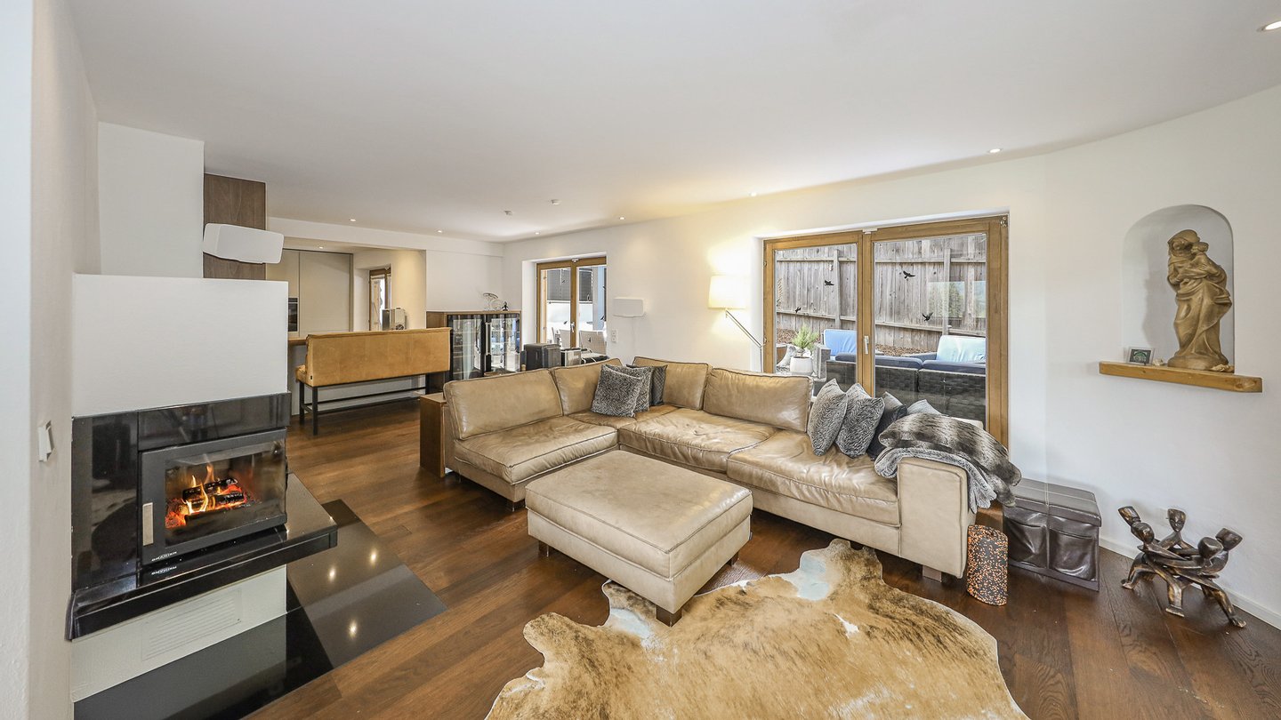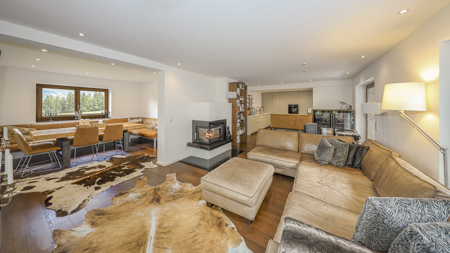 Im Erdgeschoss ist der offene Wohn- und Essbereich mit Kamin und zahlreichen großen Fenstern gelegen.