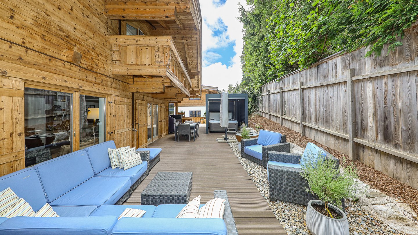 Vom Wohnbereich sowie der Küche gelangt man auf die sehr große Terrasse.