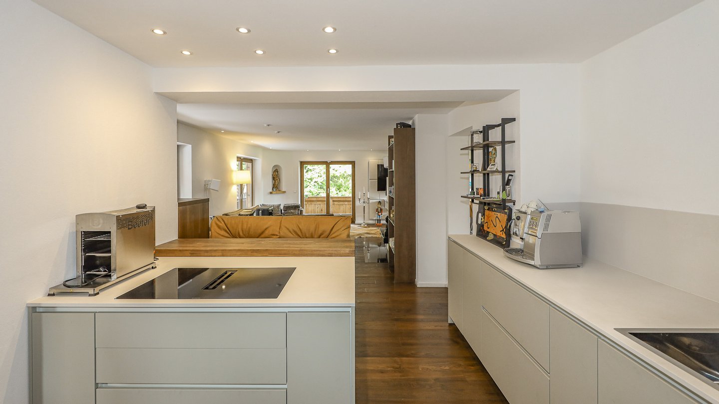 An den Woh-/Essbereich angrenzend befindet sich die Designerküche der Marke Nobilia und ist mit hochwertigen Geräten komplett ausgestattet.