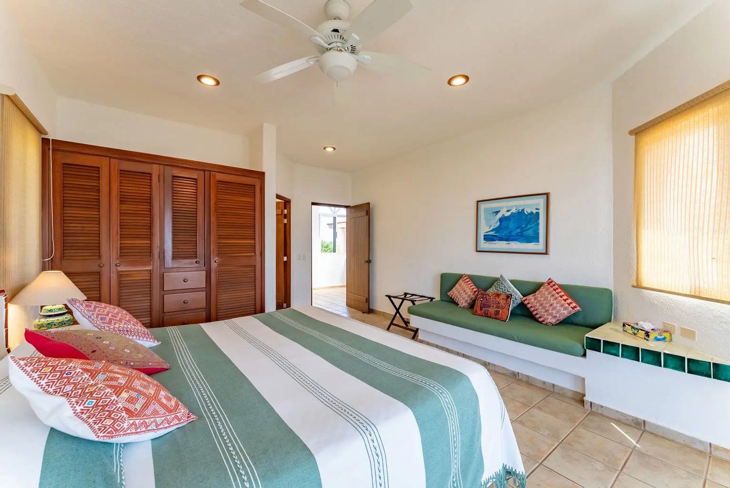 Diese Luxusvilla ist wirklich einzigartig, da sie von Enrique Alcaraz, dem bekannten mexikanischen Architekten und bildenden Künstler, entworfen, entworfen und gebaut wurde. Casa Dos Palmas ist eine außergewöhnliche Verschmelzung der Architektur im Maya-Stil mit einer dreistöckigen, handgefertigten Maya-Cupula (Backsteinkuppel) und originalen Talavera-Fliesen im authentischen Hacienda-Stil. Die Möbel sind handgefertigt, und es gibt Möbelschränke aus Mahagoni. Original Art & Murals sind ein weiteres Highlight: Casa Dos Palmas wird seine beiden originalen Alcaraz-Wandmalereien behalten, die für dieses Haus von Enrique Alcaraz in Auftrag gegeben wurden. Keine andere Ocean Villa in der Gegend kann sich der Kunst, der Kuppel oder der Positionierung rühmen: über 180-Grad-Blick auf das Meer und den Sonnenaufgang und den 180-Grad-Blick auf den Dschungel am Pool. Es gibt auch einen vom Eigentümer verschlossenen Kleiderschrank, der als Speisekammer und Spirituosenschrank genutzt werden kann. Sowie Zimmersafes, die für die Sicherheit Ihrer Waren sorgen.
