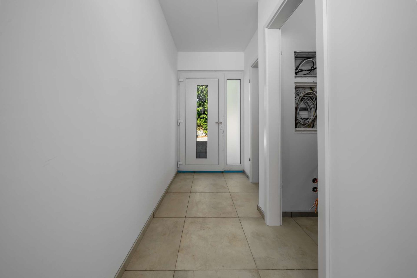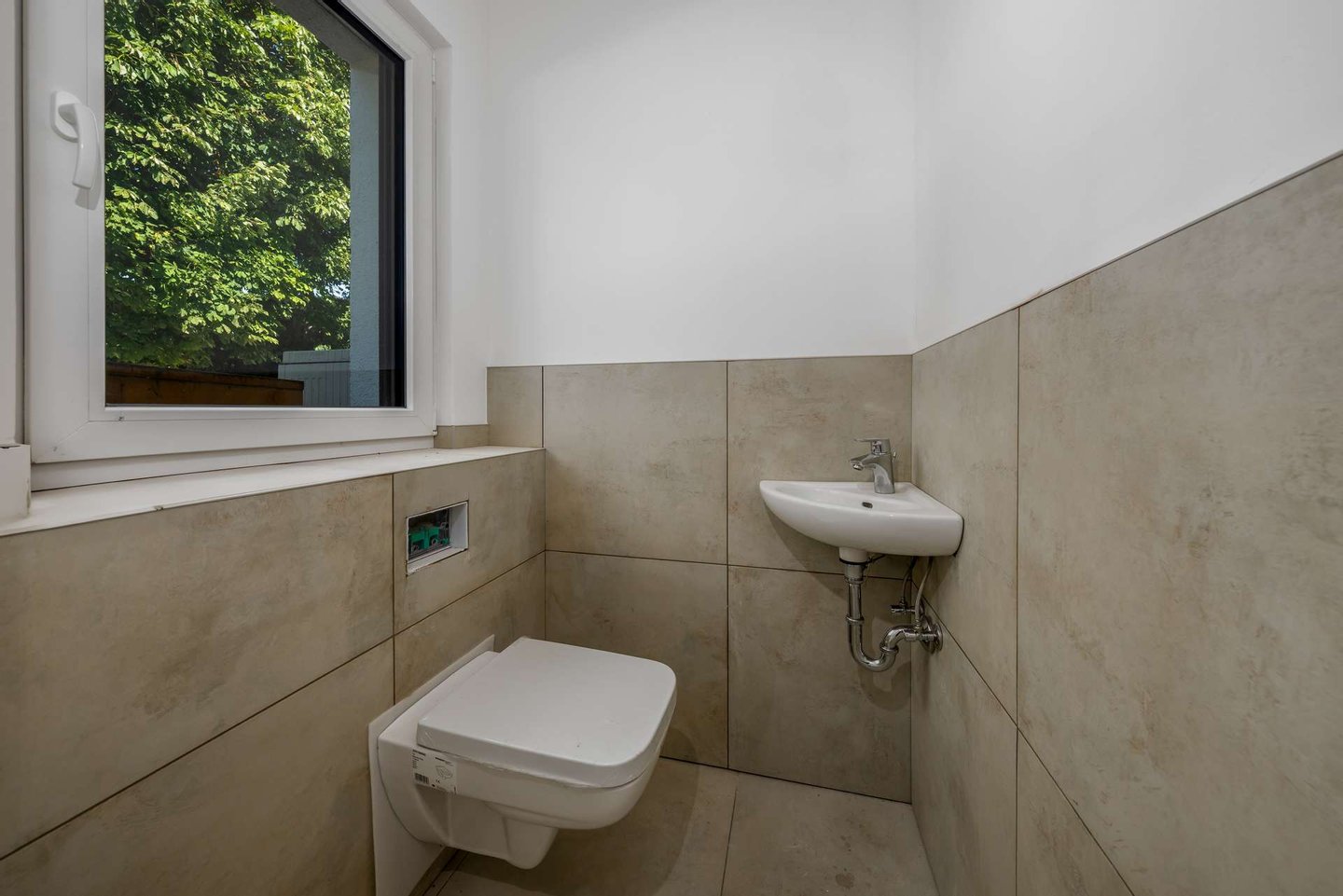 Das Badezimmer ist mit Markenkeramik der Serie Geberit PLAN, Duscharmaturen von Grohe sowie einem Waschtisch mit Unterschrank ausgestattet. Alle bodentiefen Fenster sind mit elektrischen Raffstores versehen, während alle anderen Fenster über elektrische Rollläden mit ALU-Panzer verfügen.