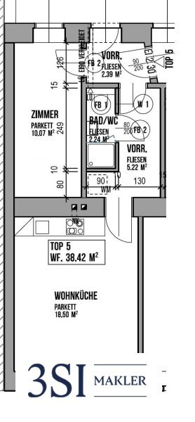 Diese teilmöblierte 2 Zimmer-Wohnung befindet sich im Erdgeschoß, verfügt über eine Wohnfläche von ca. 38,42m² und teilt sich wie folgt auf: