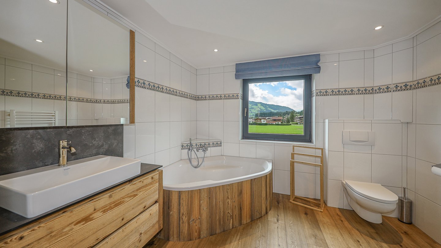 Das Masterbadezimmer mit Eckbadewanne, Dusche, WC und Waschtisch befindet sich direkt nebenan.