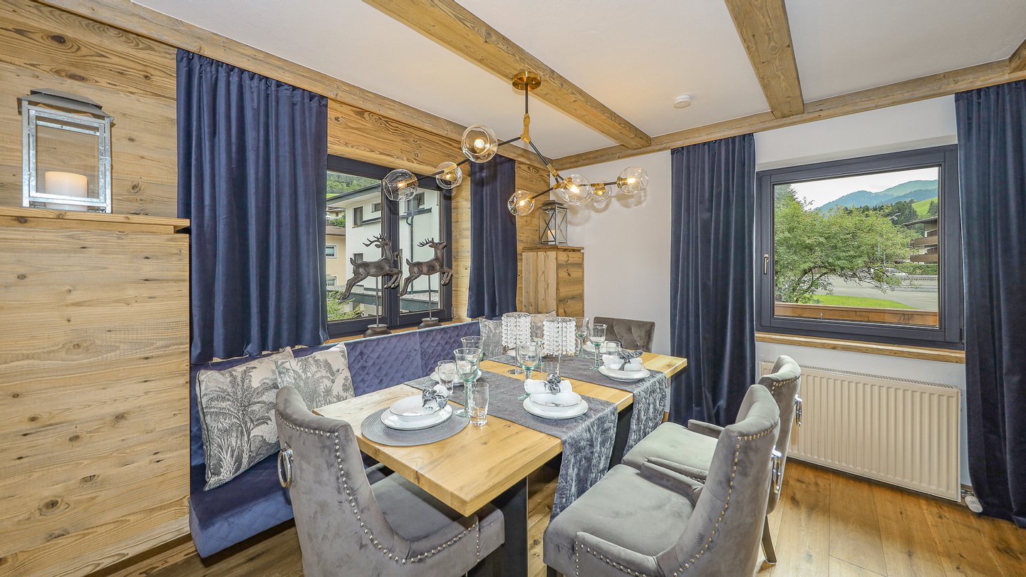 Der komplett ausgestattete Essbereich bietet Platz für 6 Personen und wurde mit hochwertiger Altholzwandvertäfelung und Schränken voll ausgestattet. An den Essbereich angrenzend befindet sich die moderne Designerküche.