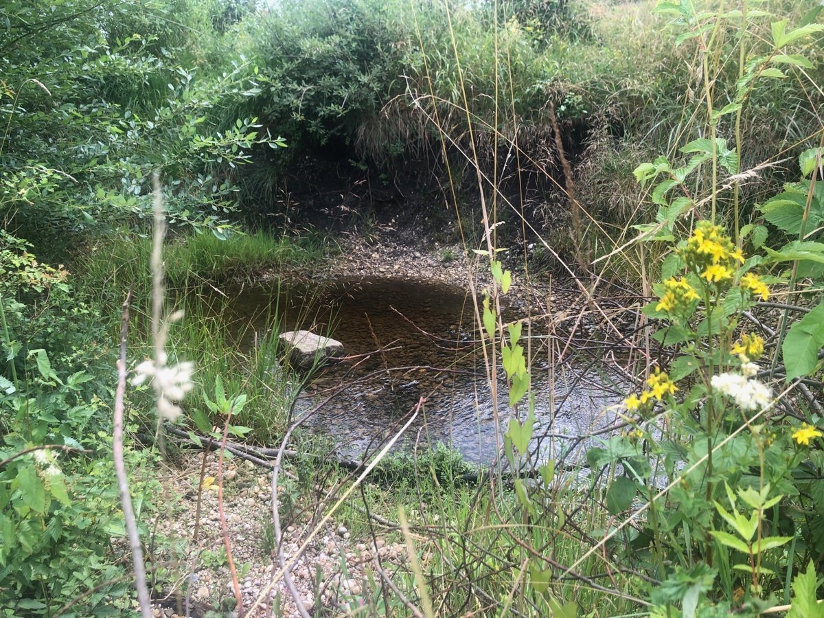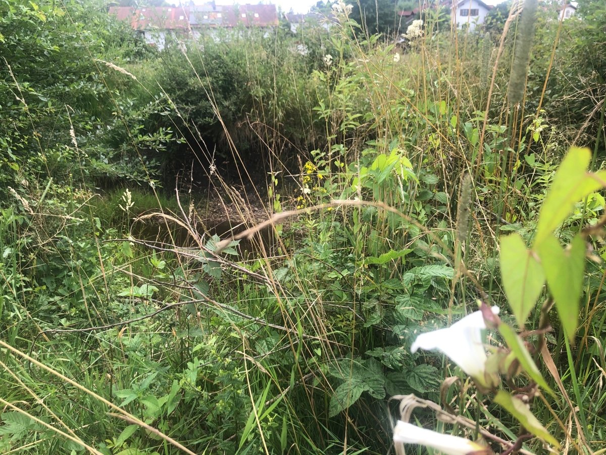 Das ideal geschnittene, perfekt bebaubare, fast quadratische Grundstück hat am hinteren Bereich einen idyllischen Bachlauf.
