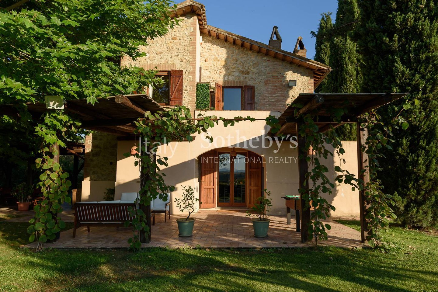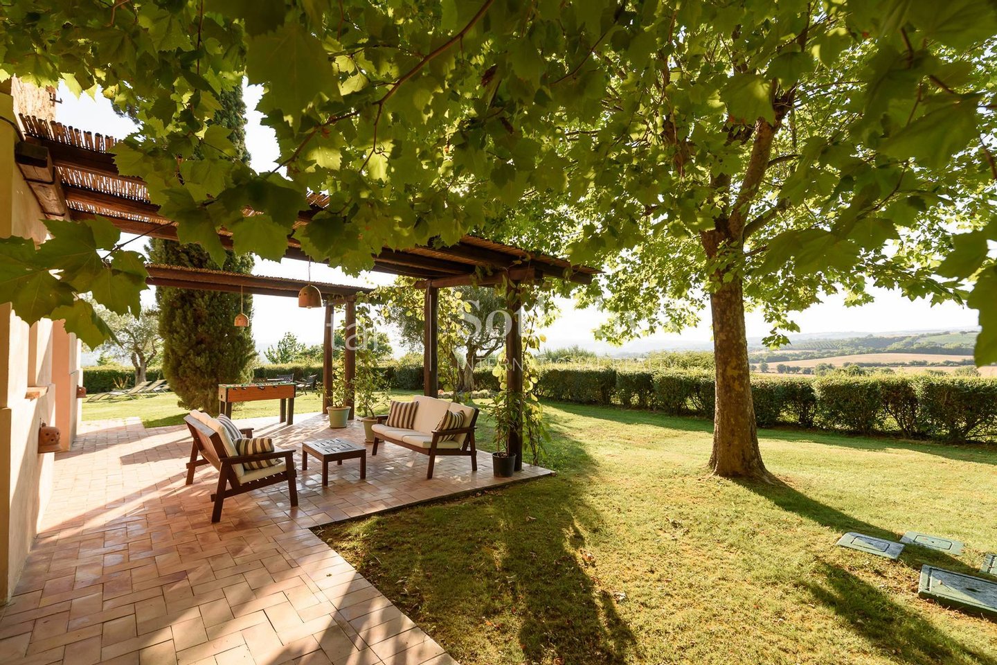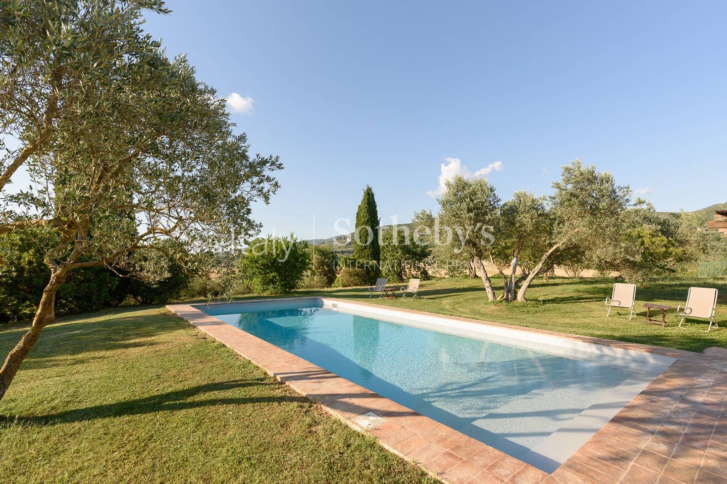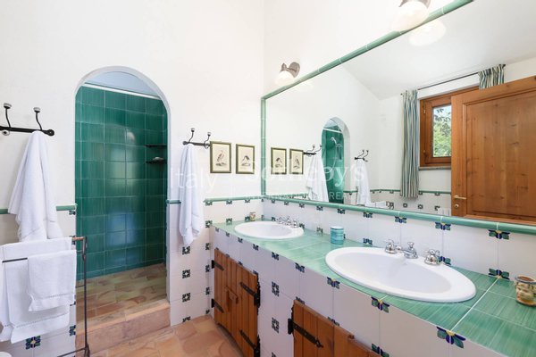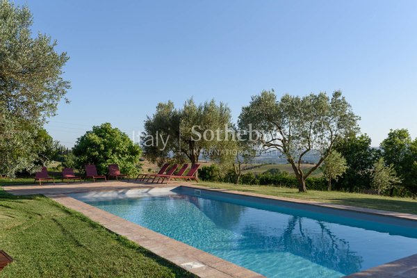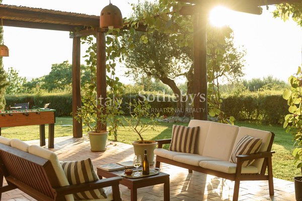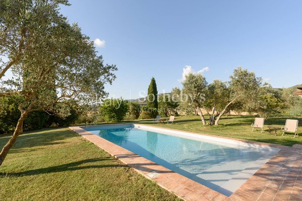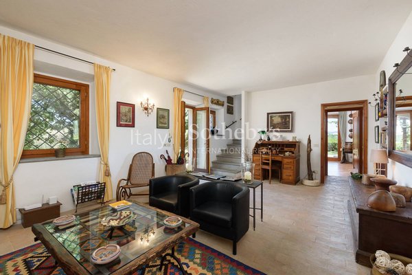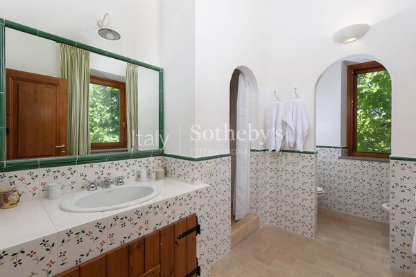 Das Haupthaus und die Dependance bieten insgesamt sieben Schlafzimmer, alle mit Klimaanlage, hochwertig ausgestatteten Bädern en suite sowie Einbauschränken oder begehbaren Kleiderschränken. Die sorgfältig restaurierten Innenräume zeichnen sich durch handgefertigte Cotto-Böden, Decken mit freiliegenden Holzbalken und große Fensterflächen aus, die den Blick auf die Landschaft einrahmen.