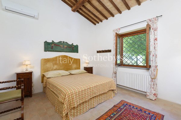 Das Haupthaus und die Dependance bieten insgesamt sieben Schlafzimmer, alle mit Klimaanlage, hochwertig ausgestatteten Bädern en suite sowie Einbauschränken oder begehbaren Kleiderschränken. Die sorgfältig restaurierten Innenräume zeichnen sich durch handgefertigte Cotto-Böden, Decken mit freiliegenden Holzbalken und große Fensterflächen aus, die den Blick auf die Landschaft einrahmen.