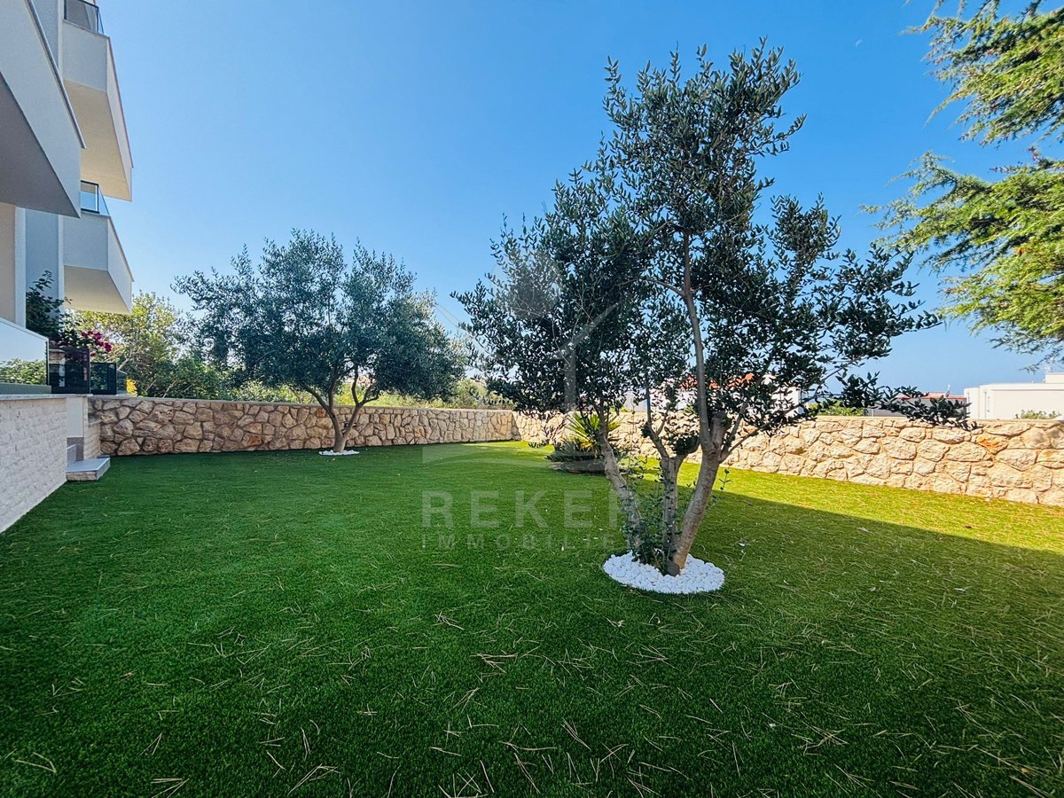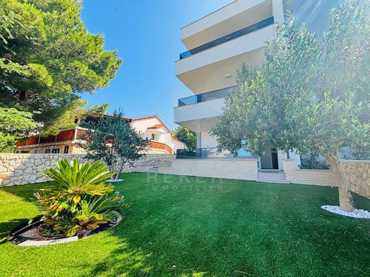 Das Wohnhaus ist ein Neubau mit sechs Wohnungen – zwei pro Etage. Ein klares, modernes Gebäude. Die Wohnungen erreicht man über ein helles Treppenhaus mit Granitstufen und Edelstahlgeländer. Die Fassade ist weiß, der Bau wirkt hochwertig und gepflegt. Auch draußen stimmt alles: angelegte Rasenflächen, Zypressen, Olivenbäume, Steinmauern – und gepflasterte Parkplätze direkt vor dem Haus. Jede Wohnung hat hier ihren festen Stellplatz.