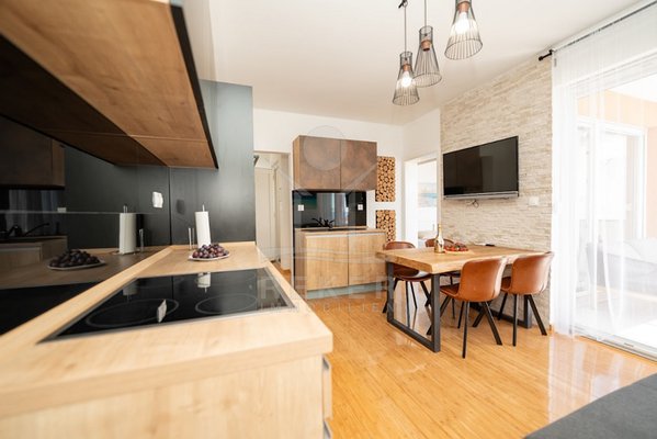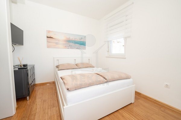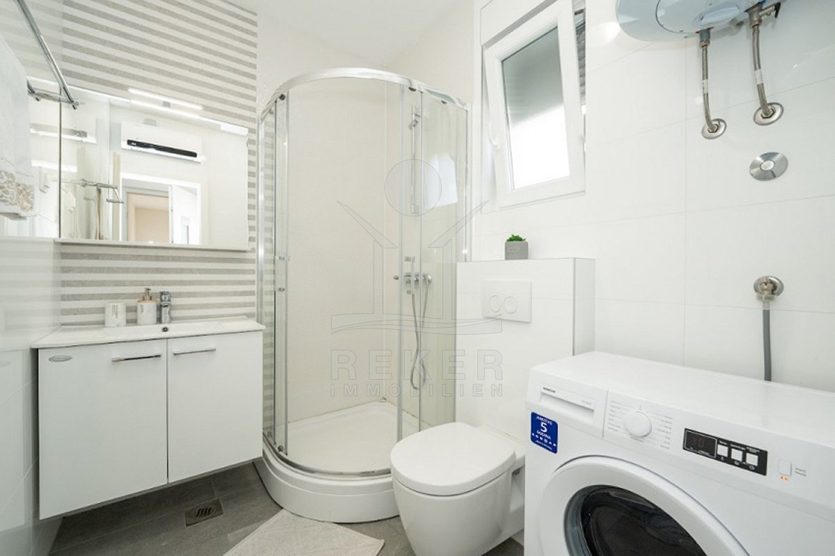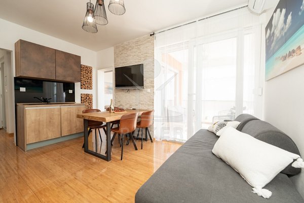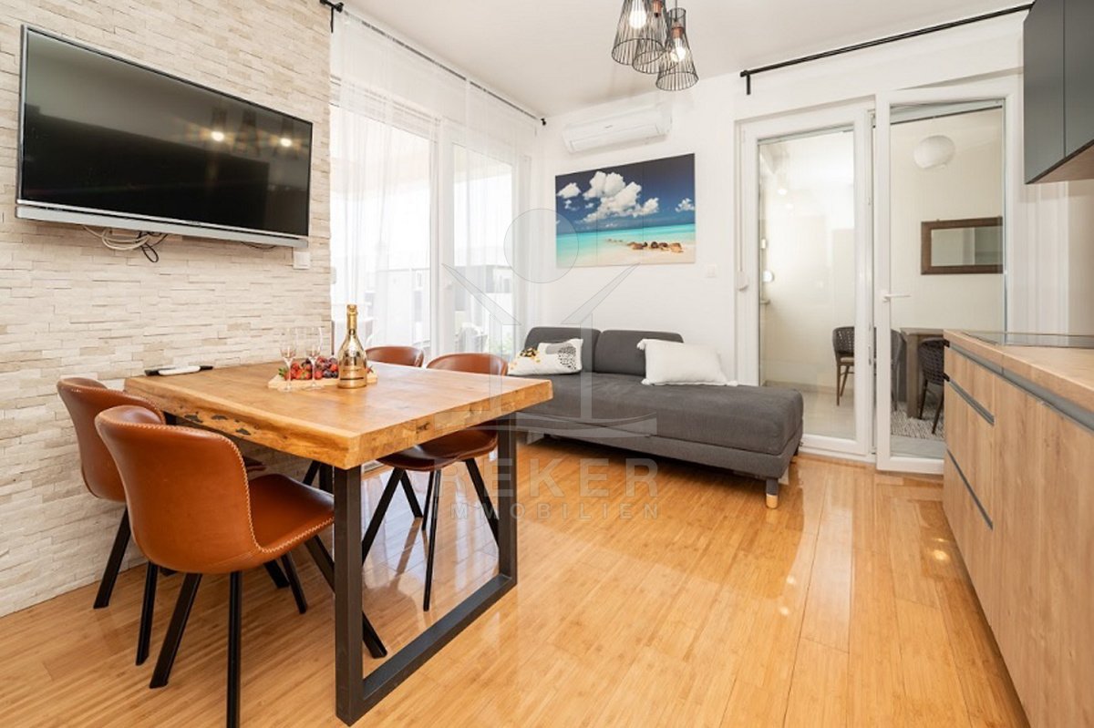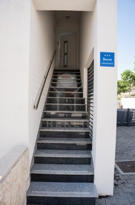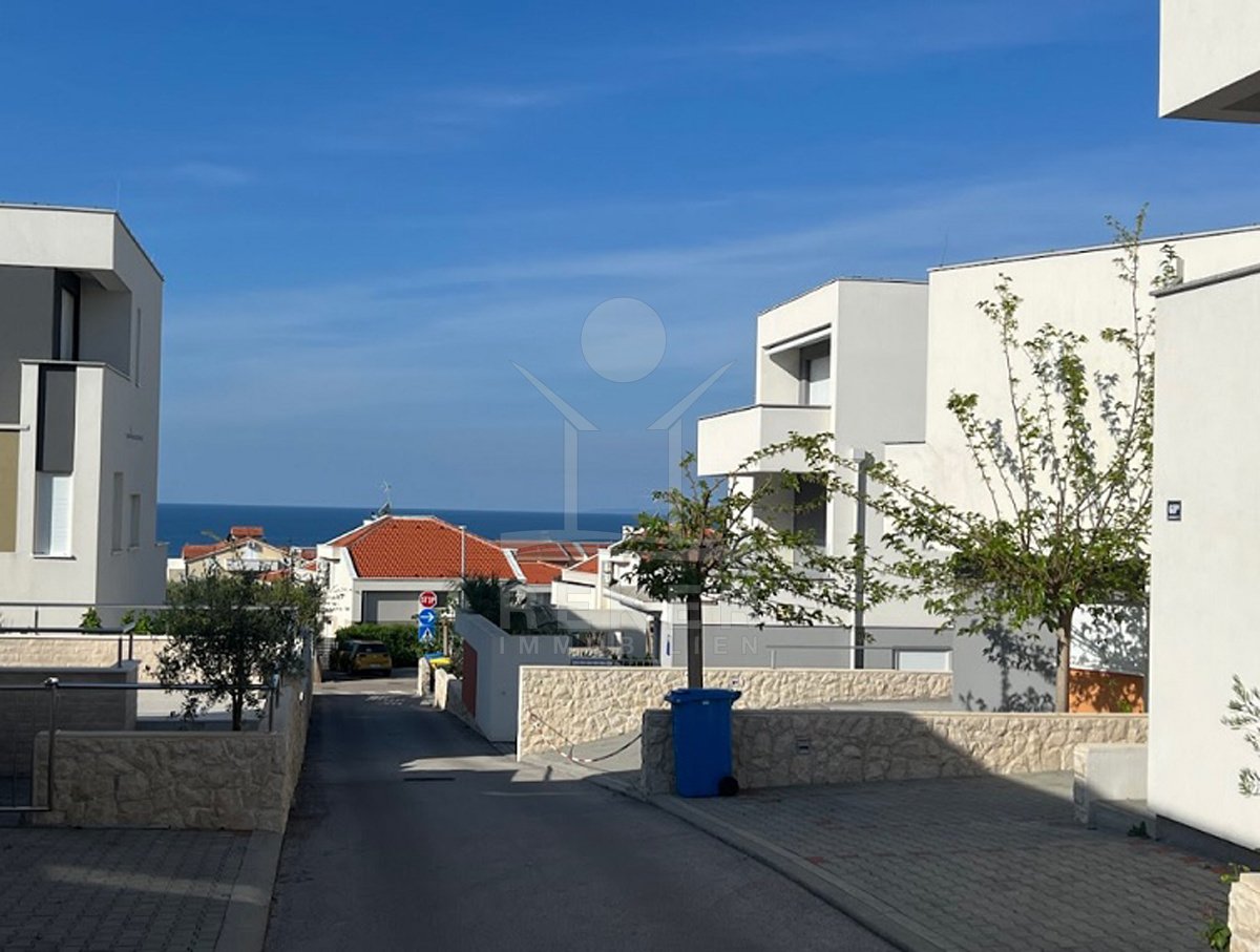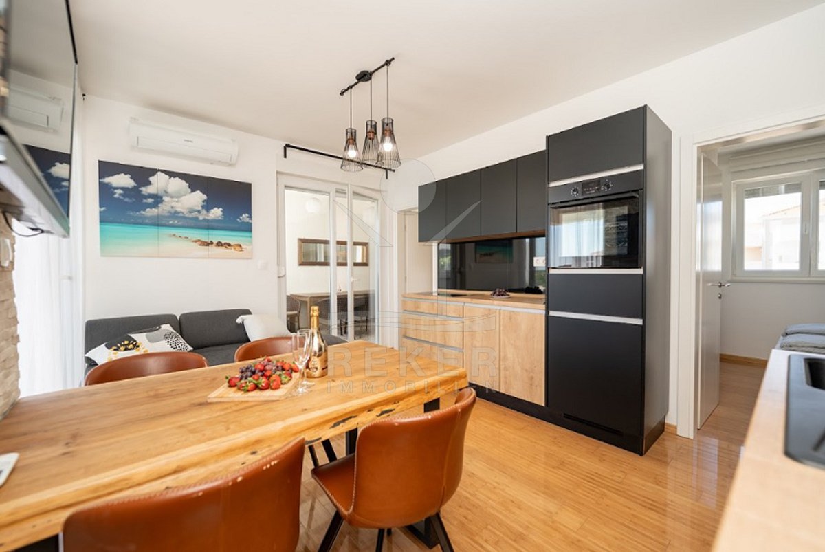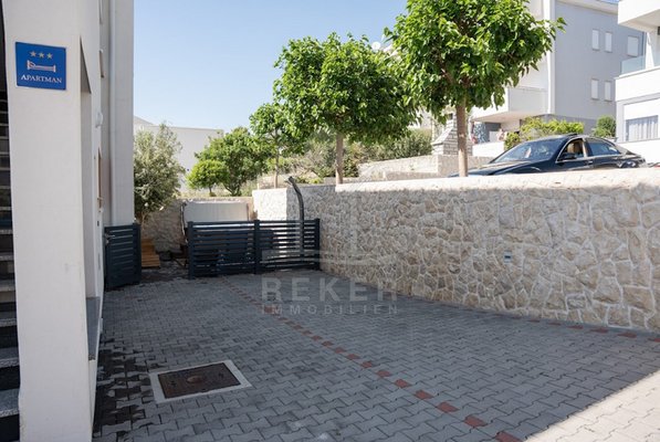 Ruhige Lage, kurze Wege: Diese moderne Vierzimmerwohnung befindet sich nur rund zehn Gehminuten vom Meer und vom Zentrum von Novalja entfernt. Sie wohnen in einem gepflegten Gebäude in einer ruhigen Wohnstraße mit zwei eigenen Stellplätzen direkt am Haus – ein echter Vorteil, besonders im Sommer.