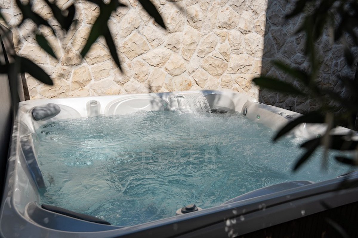 Im Außenbereich erwartet Sie ein privater Garten mit Whirlpool. Ideal für entspannte Abende oder kleine Auszeiten unter freiem Himmel. Die Fläche ist eingefasst von einer Natursteinmauer, Sichtschutz und Ruhe sind damit inklusive. Zum Garten gehört außerdem ein kleiner Abstellraum im Erdgeschoss – praktisch für Fahrräder oder Strandzubehör.