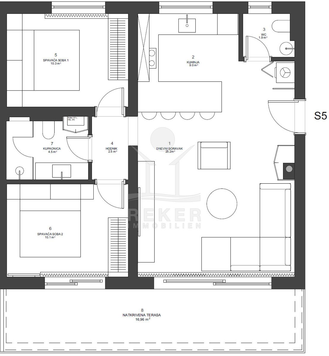 Wohnung A5 liegt im ersten Obergeschoss – perfekt für Licht, Luft und Privatsphäre. Der großzügige Balkon bietet Sonne ab Mittag und einen freien Blick Richtung Küste.