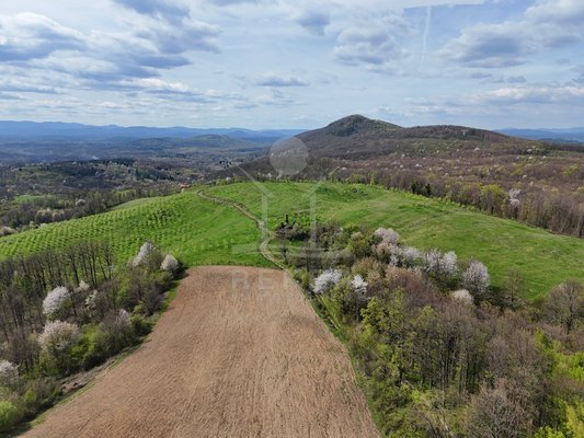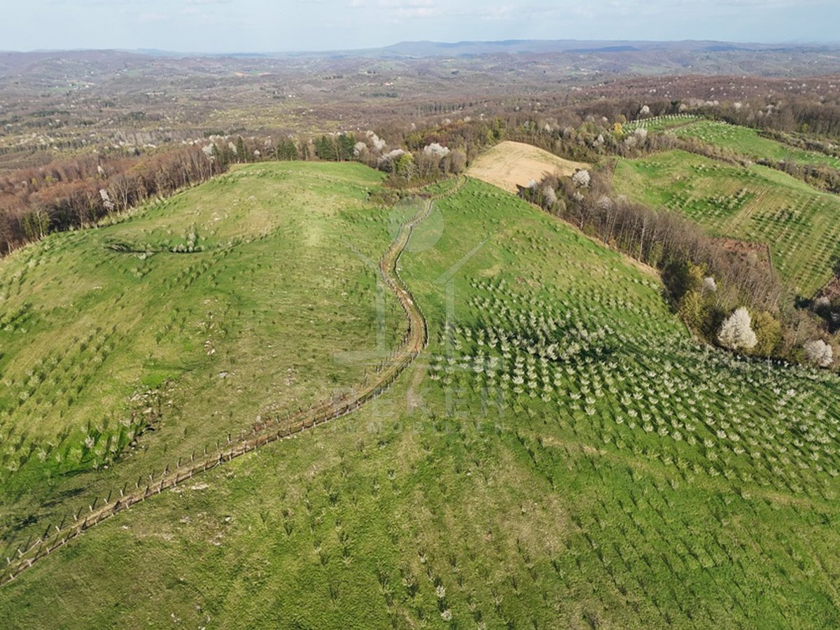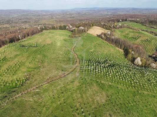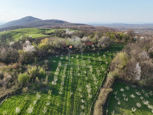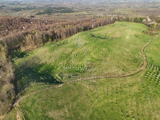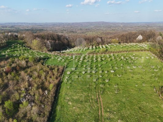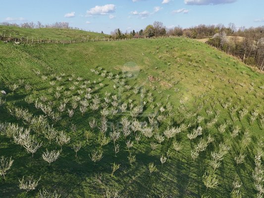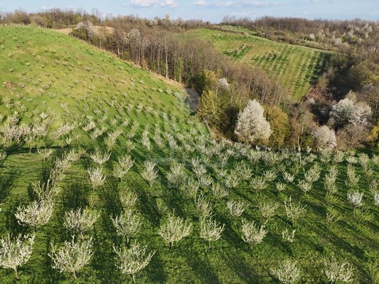 39 Hektar Land, durchzogen von sanften Hügeln, Obstplantagen und Wiesen. Das Grundstück liegt in ruhiger, ländlicher Umgebung und ist komplett erschlossen durch eine asphaltierte Zufahrt. Die Umgebung ist naturbelassen und bietet viel Privatsphäre. Auf 31,77 Hektar wachsen bereits Pflaumen-, Walnuss- und Mandelbäume in gepflegten Reihen. Die restlichen Flächen sind teils bewaldet, teils als Wiese nutzbar.
