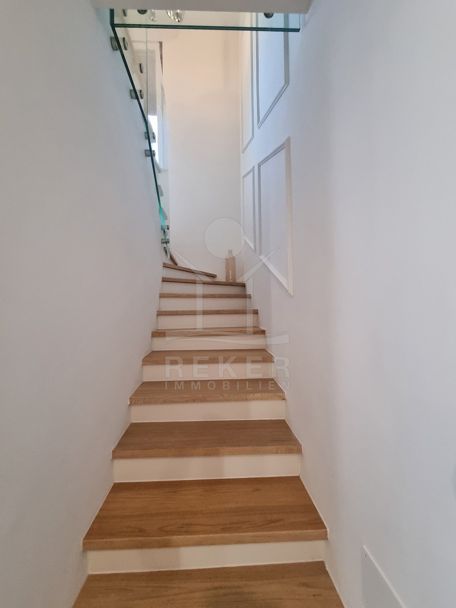 Das Haus hat drei Etagen und nur vier Wohneinheiten. Jede Wohnung ist zweigeschossig – Maisonette-Stil. Der Neubau stammt aus dem Jahr 2023. Kein Aufzug, aber ein helles, gepflegtes Treppenhaus mit Natursteinstufen. Alle Wohnungen haben einen eigenen Abstellraum im Untergeschoss. Dazu gehört je ein Stellplatz direkt vor dem Haus. Der Außenbereich ist sauber gepflastert, mit einem blickdichten Zaun eingefasst.