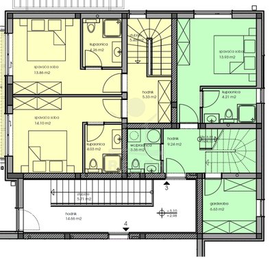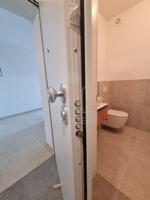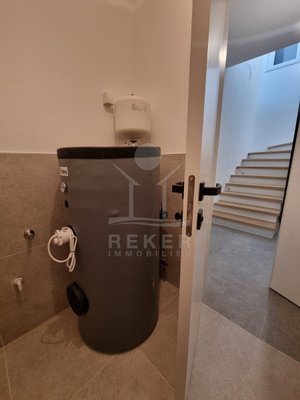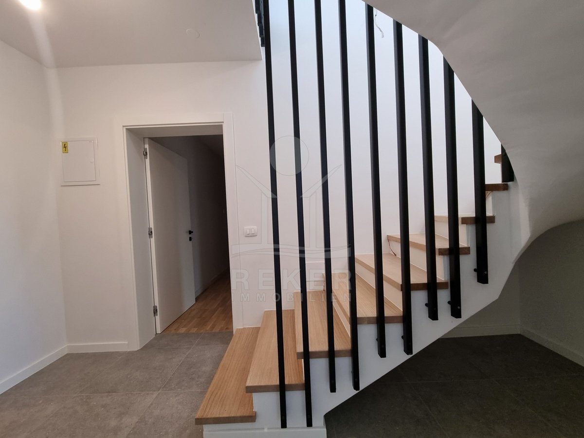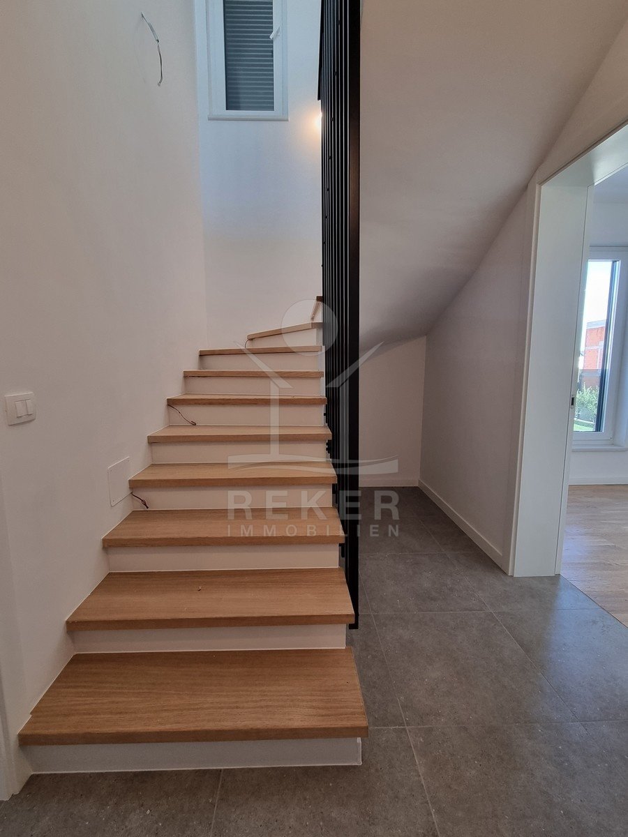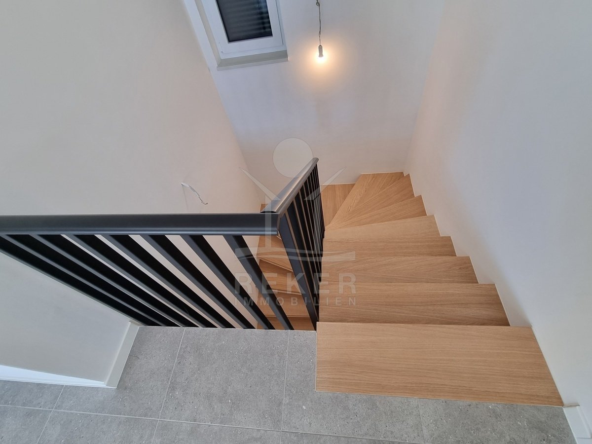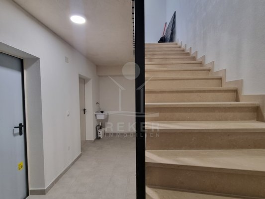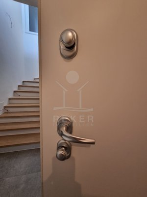 Das Haus hat drei Etagen und nur vier Wohneinheiten. Jede Wohnung ist zweigeschossig – Maisonette-Stil. Der Neubau stammt aus dem Jahr 2023. Kein Aufzug, aber ein helles, gepflegtes Treppenhaus mit Natursteinstufen. Alle Wohnungen haben einen eigenen Abstellraum im Untergeschoss. Dazu gehört je ein Stellplatz direkt vor dem Haus. Der Außenbereich ist sauber gepflastert, mit einem blickdichten Zaun eingefasst.