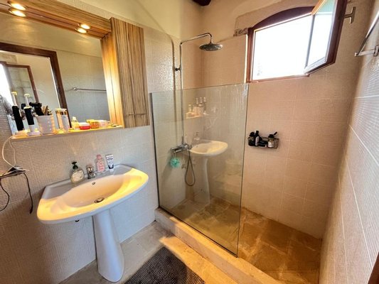 Im Obergeschoss befinden sich zwei große Schlafzimmer mit eigenem Bad und Dusche, jeweils mit Zugang zu einem großen Balkon mit Blick auf Olivenhaine und die umliegende Landschaft. Beide Zimmer bieten viel Stauraum mit dreitürigen Kleiderschränken, hohen Holzdecken und sind für eine Zentralheizung vorbereitet.