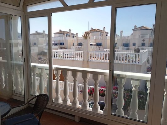 Diese überdurchschnittlich große Eckwohnung im ersten Stock befindet sich in einzigartiger Lage neben dem Gemeinschaftspool. Die Immobilie umfasst 2 Doppelzimmer, einen sehr großen Wohn-/Essbereich, eine offene Küche und ein komplettes Badezimmer. Terrassentüren führen auf die großzügige Terrasse, von der aus eine Außentreppe zum riesigen Solarium hinaufführt, wo Sie den ganzen Tag die Sonne genießen können, mit eingebautem Grill und herrlichem Blick auf die Umgebung.