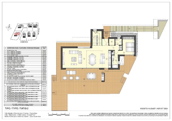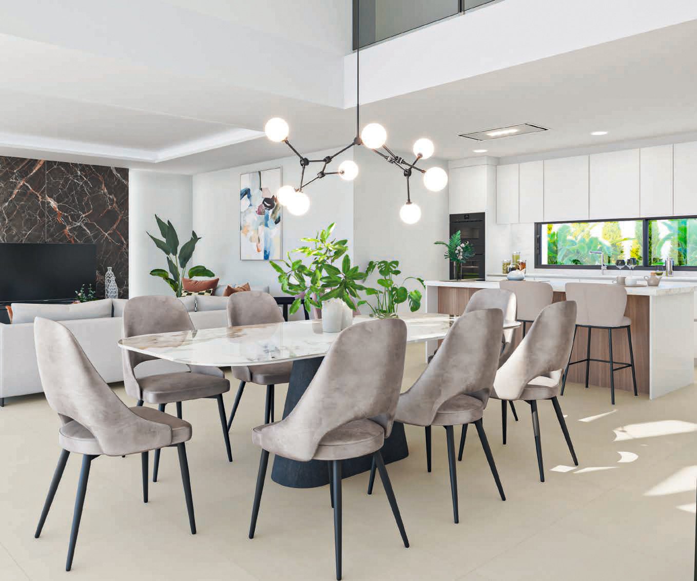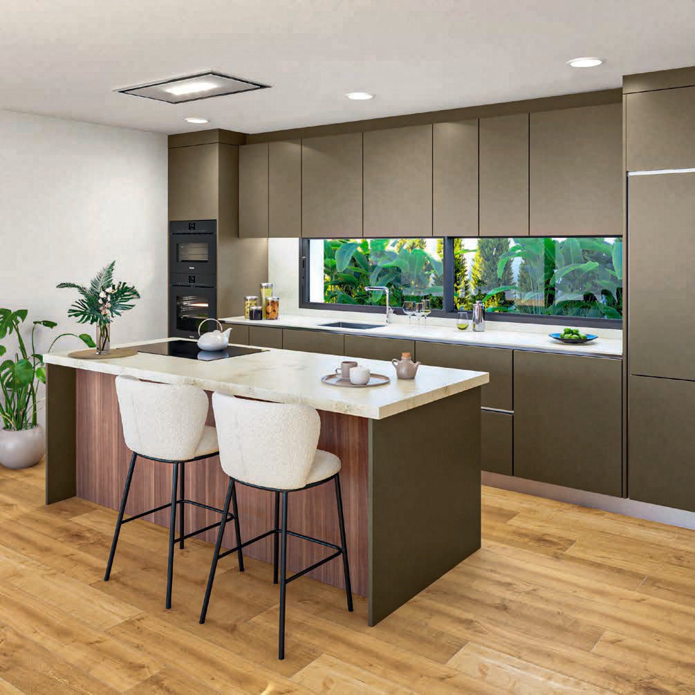 Die Hauptebene verfügt über ein offenes Layout, das die Küche, den Ess- und den Loungebereich vereint und das perfekte Ambiente zum Entspannen und Unterhalten schafft. Die Küche ist elegant gestaltet, mit hochwertigen Geräten und hochwertigen Oberflächen.