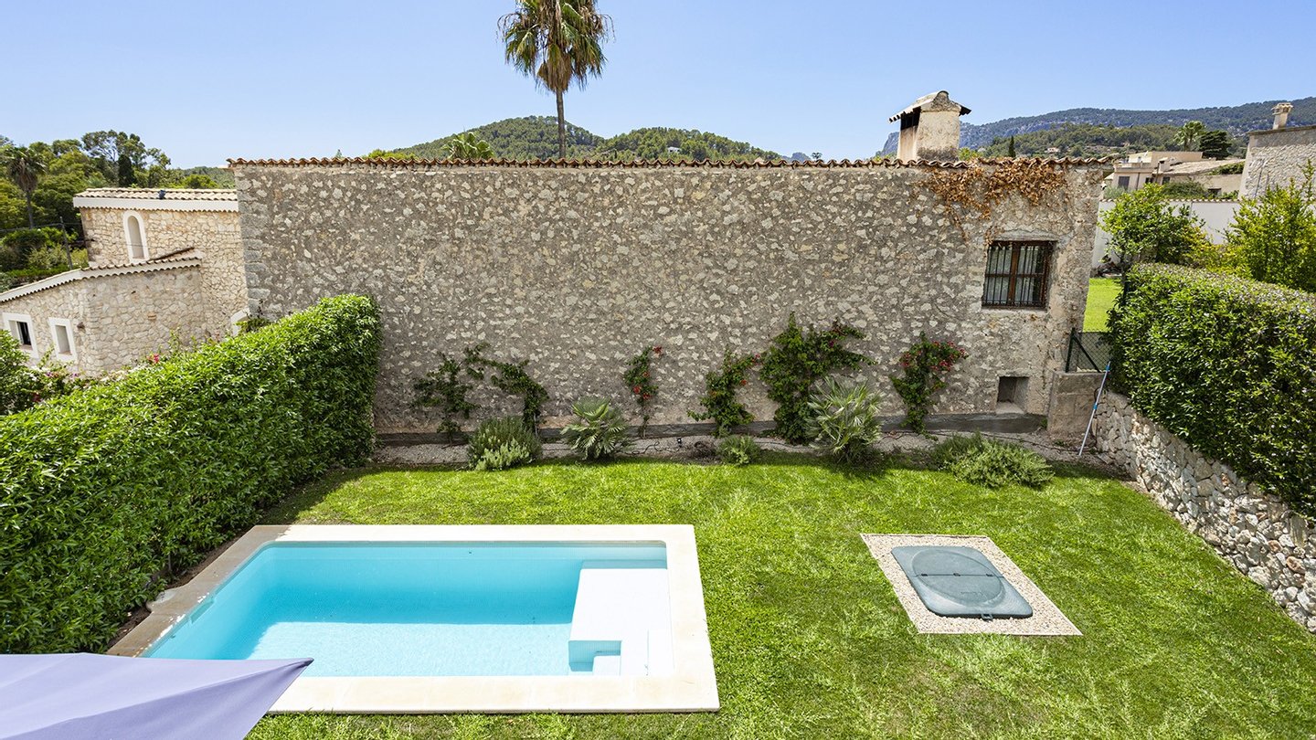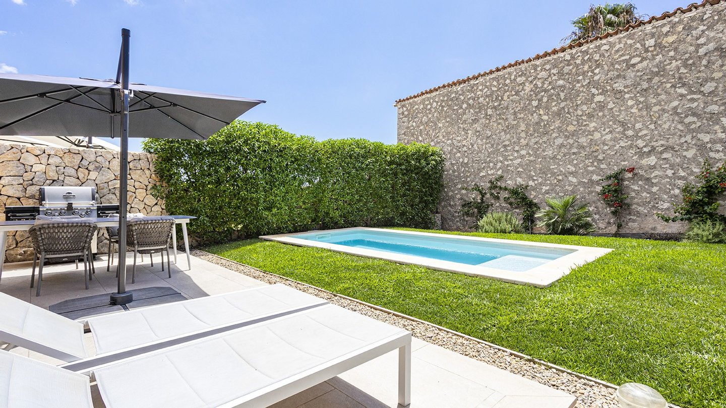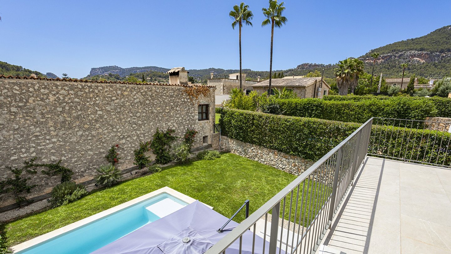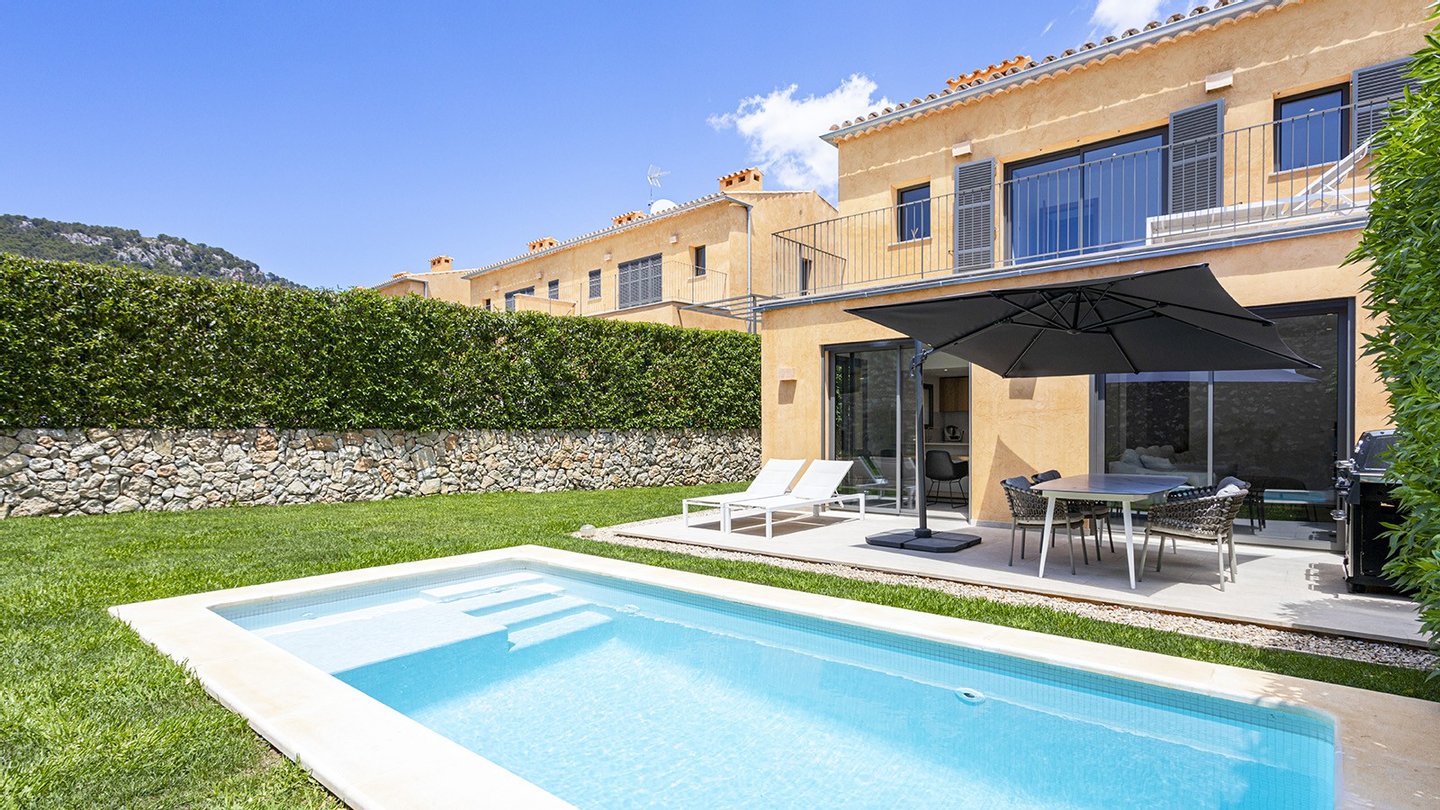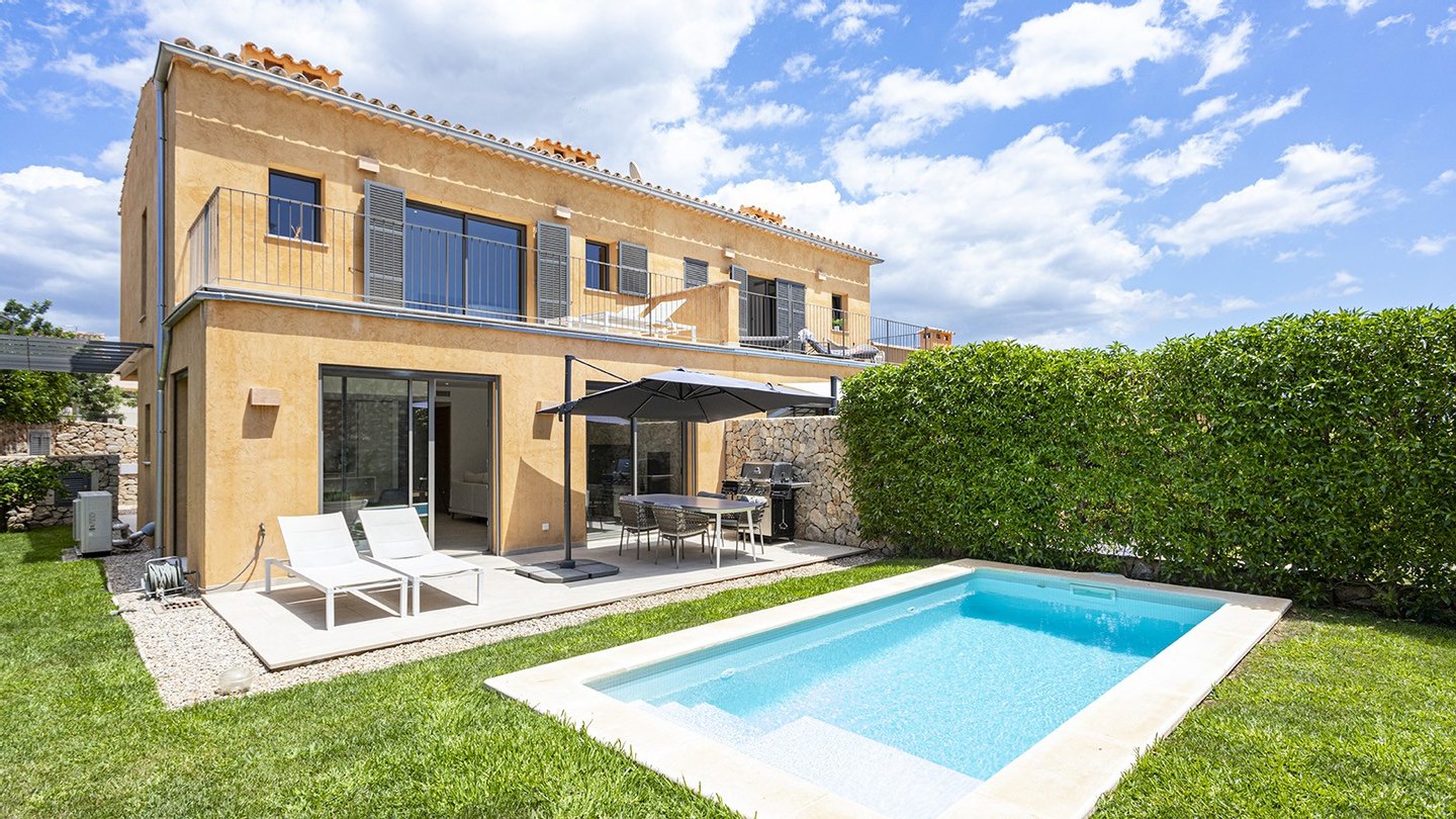 Inmitten des malerischen Dorfes Es Capdellà erwartet Sie dieses stilvolle ,im Jahr 2024 erbaute Doppelhaushälfte, das mediterrane Architektur mit zeitgemäßem Wohnambiente gekonnt miteinander verbindet. Auf 135?m² Wohnfläche und einem 243?m² großen Grundstück genießen Sie Ruhe, Komfort und mallorquinisches Flair.Die Innenräume des Hauses präsentieren sich modern und hochwertig ausgestattet. Drei Schlafzimmer und zwei stilvolle Badezimmer bieten komfortables Wohnen für die ganze Familie. Eine offene Einbauküche mit Elektrogeräten fügt sich nahtlos in den Wohnbereich ein, während Hauswirtschafts- und Abstellraum für Ordnung im Alltag sorgen. Für ganzjährig angenehmes Raumklima sorgen eine Fußbodenheizung mit Wärmepumpe sowie eine Klimaanlage . Die Möblierung ist auf Wunsch optional erhältlich. Hochwertige Fliesenböden, isolierende Aluminiumfenster mit Doppelverglasung sowie passende Blendläden zeugen von einer sorgfältigen Materialwahl und einem stimmigen Gesamtkonzept. Die Immobilie ist mit zeitgemäßer Haustechnik ausgestattet: Ein Glasfaseranschluss ermöglicht eine schnelle Internetverbindung, ergänzt durch SAT-TV und einen klassischen Telefonanschluss.Eine integrierte Trinkwasserfilteranlage bietet zusätzlichen Komfort im Alltag. Ein echtes Highlight der Immobilie ist der großzügige Außenbereich: Der ca. 175?m² große, liebevoll angelegte Garten lädt zum Entspannen und Genießen ein. Ob sonnige Nachmittage am privaten Salzwasserpool oder gesellige Abende im integrierten BBQ-Bereich - hier entstehen unvergessliche Momente unter freiem Himmel. Die gepflegte Außenfläche bietet viel Platz für Familie, Freunde und mediterranes Lebensgefühl pur. Parkmöglichkeiten sind ebenfalls vorhanden. Es stehen Ihnen 2 Pkw Stellplätze zur Verfügung,welche durch ein elektrisches Zufahrtstor gesichert sind.