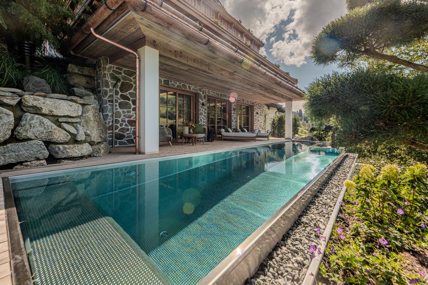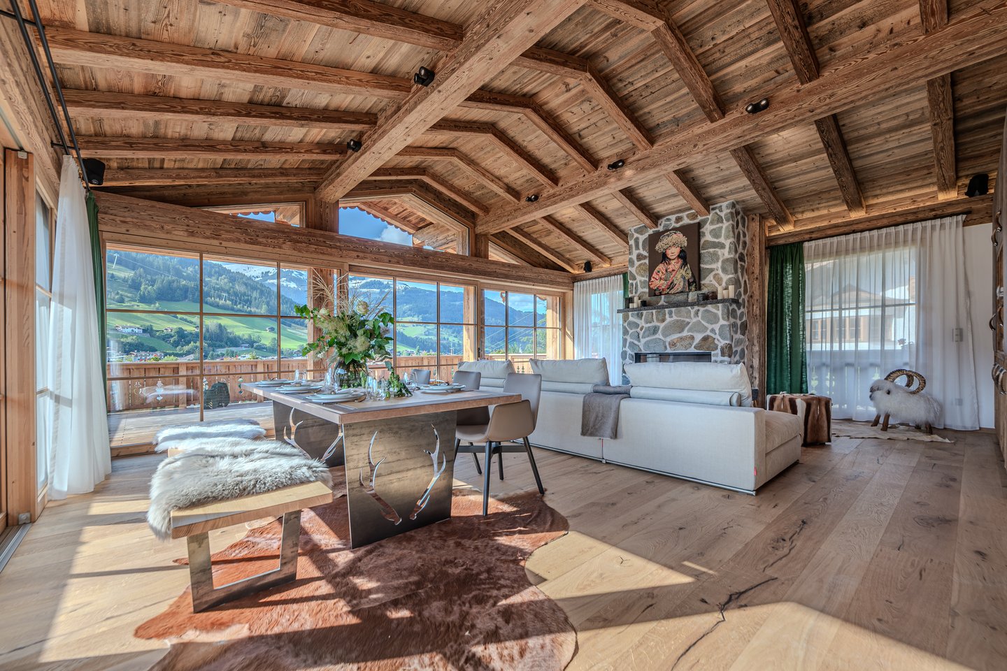 Alpenländische Geschichte verbindet sich mit allen Annehmlichkeiten heutigen Komforts. Neben unzähligen Details verfügt das rund 600 Quadratmetergroße Chalet inklusive Terrassen und Balkone über einen traumhaften Blick auf die Bergwelt: hohe Fensterflächen im obersten Stockwerk öffnen den Blick bis hin zum großen Panorama des Kitzbüheler Horns. In Gegenrichtung erhebt sich das Massiv des Großvenediger, der nächste Skilift befindet sich in kurzer Distanz zu MOUNTAINMENTS ONE.
