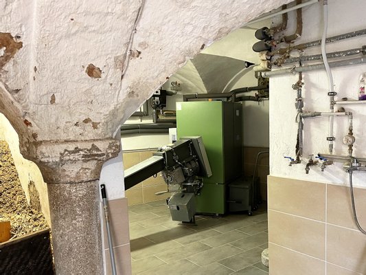 Sie teilt sich im Erdgeschoss in eine große Küche mit Essplatz, ein Wohnzimmer, ein Badezimmer mit Dusche sowie einen Abstellraum auf. Im 1. Obergeschoss befinden sich drei Schlafzimmer. Aus unserer Sicht bieten sich die Wohnungen auch sehr gut zum Zusammenlegen und zur Nutzung als großes Einfamilienhaus an. Die stilvollen Gewölberäume im Erdgeschoss werden aktuell als Heizraum und Lagerraum für die Hackschnitzelheizung genutzt.