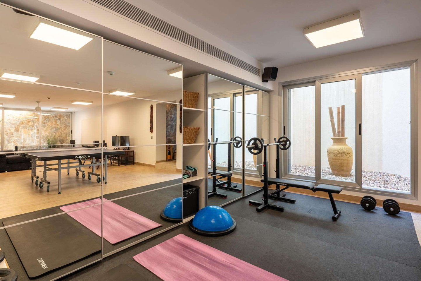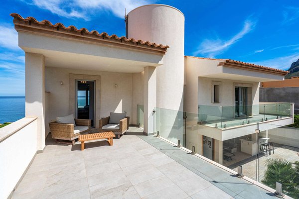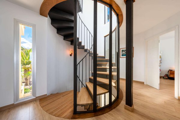 Das Design des Hauses vereint traditionelles mallorquinisches Flair mit modernen Elementen. Besonders hervorzuheben ist die handgefertigte, vierstöckige Wendeltreppe aus Eisen, die das Zentrum des Hauses bildet und den Zugang vom Medienraum/Fitnessraum im Untergeschoss bis hinauf zum Dach ermöglicht. Diese außergewöhnliche Treppe wurde vom Künstler Antonio Seron Blasco gefertigt und fügt sich perfekt in das Gesamtkonzept des Hauses ein. Die traditionellen Tonziegeldächer und die großzügigen Fensterflächen, die den Blick auf das Meer und die Berge freigeben, schaffen ein harmonisches Zusammenspiel aus Moderne und Tradition.