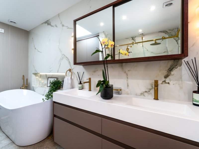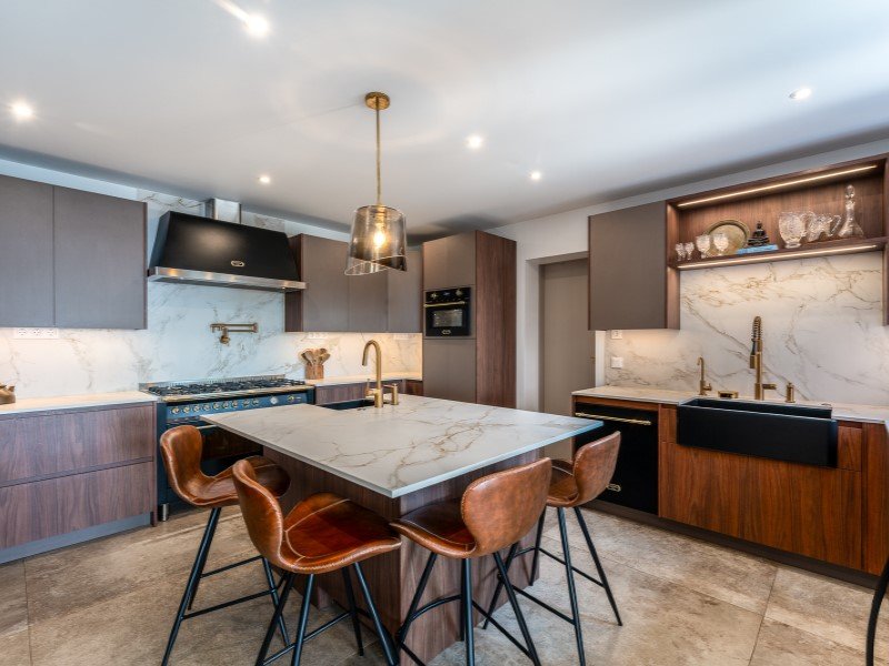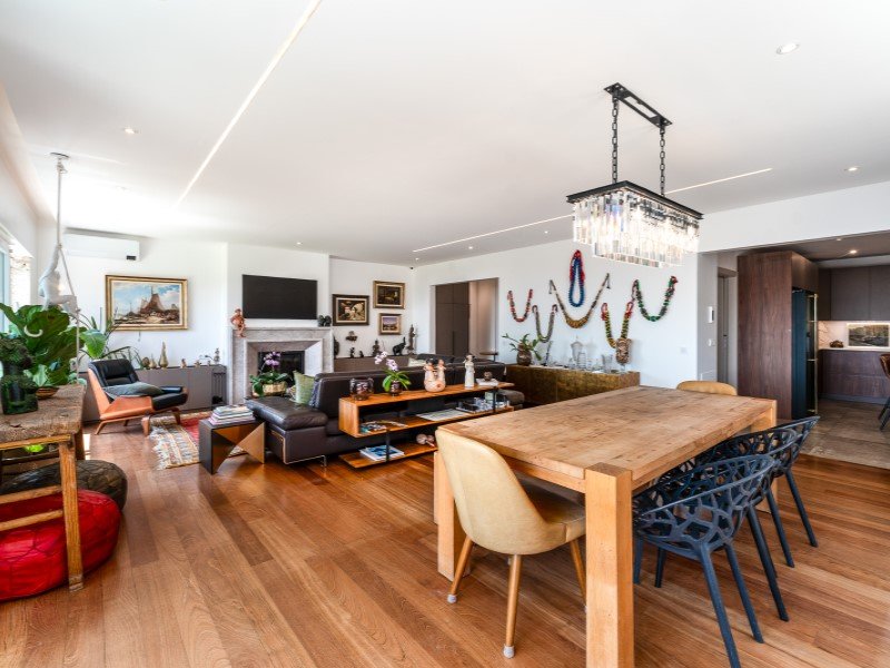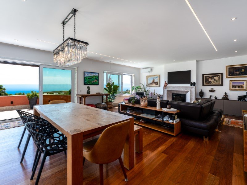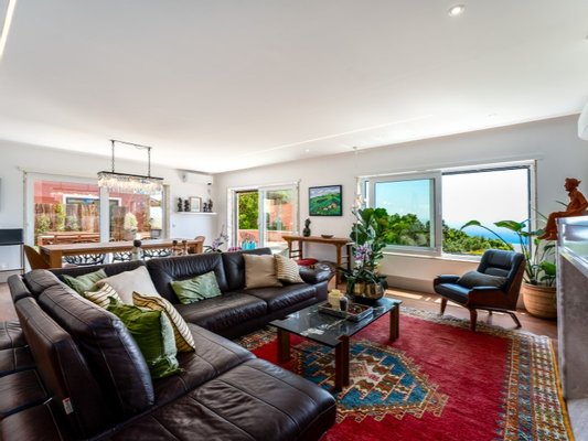 * Wohn- und Esszimmer mit Kamin und Meerblick