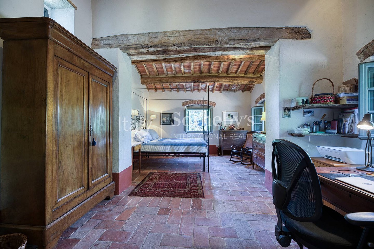 Im Haupthaus gelangt man im ersten Stock zur Master-Suite mit Arbeitszimmer und eigenem Bad. Ein überdachter Balkon führt zum Hausflügel mit zwei weiteren Schlafzimmern, die sich ein Badezimmer teilen. Im zweiten Stock beherbergt der kleine Turm heute ein elegantes Arbeitszimmer mit Panoramablick.