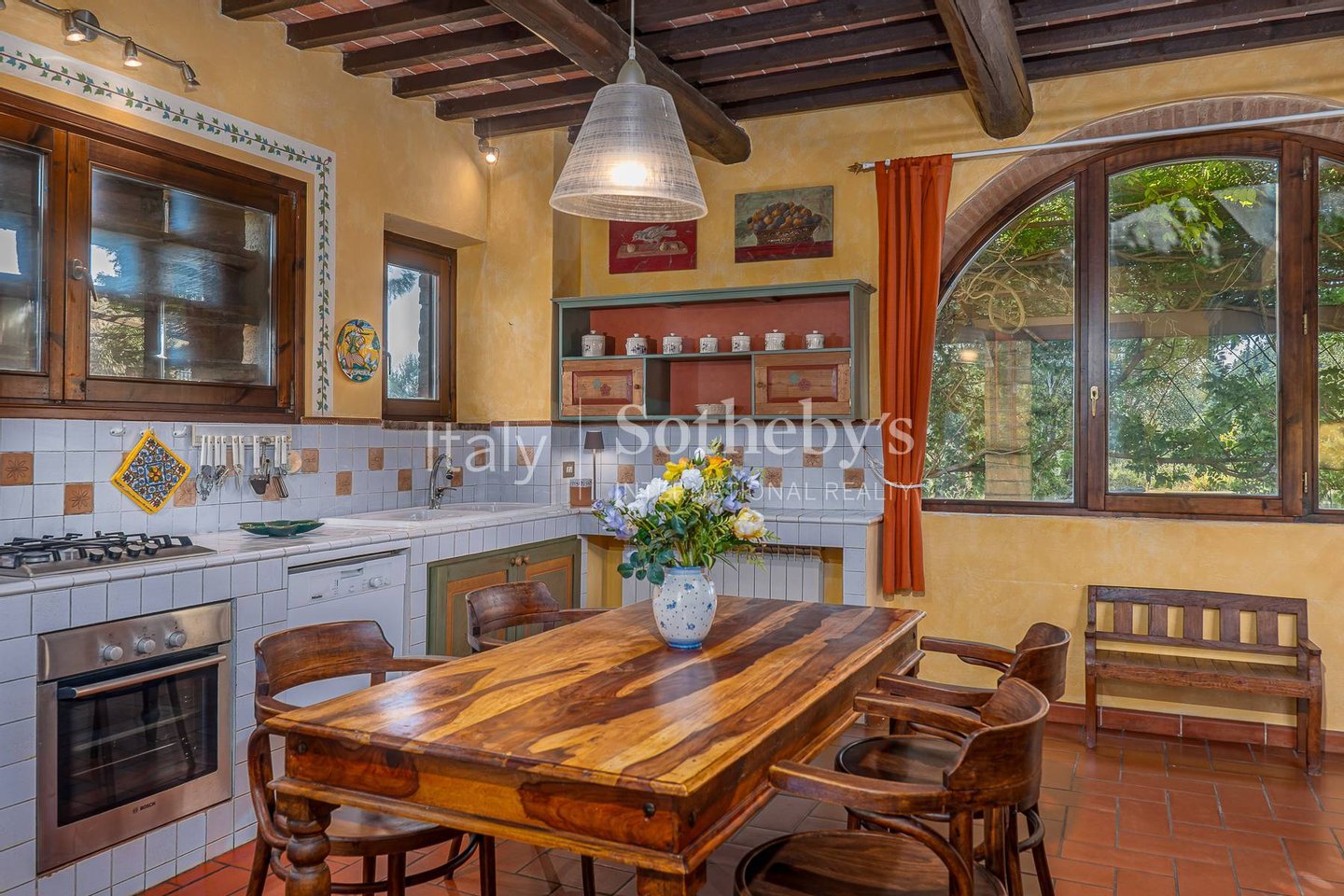 Neben der Villa bietet eine sorgfältig restaurierte Dependance auf zwei Ebenen, die den authentischen Charakter der toskanischen Tradition bewahrt, Gästen maximalen Komfort und Privatsphäre. Im Erdgeschoss befinden sich eine Wohnküche und ein Zimmer mit großen Fenstern, die auf zwei Pergolen blicken; im Obergeschoss sind zwei Schlafzimmer und ein Badezimmer untergebracht.