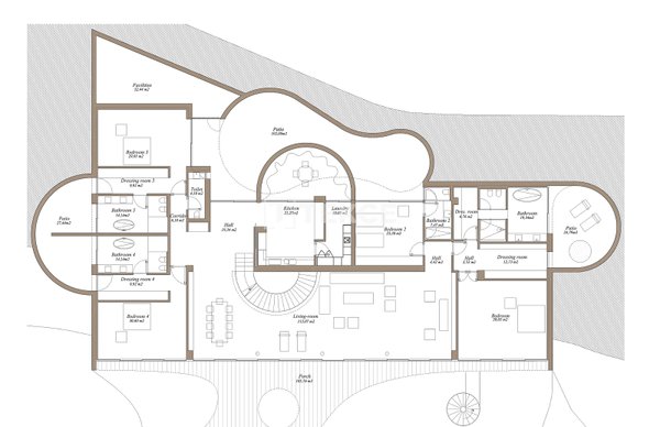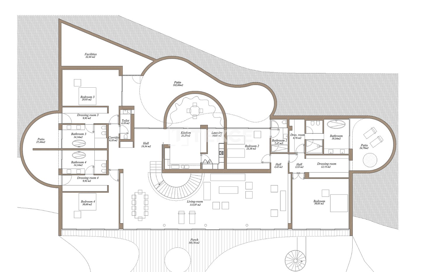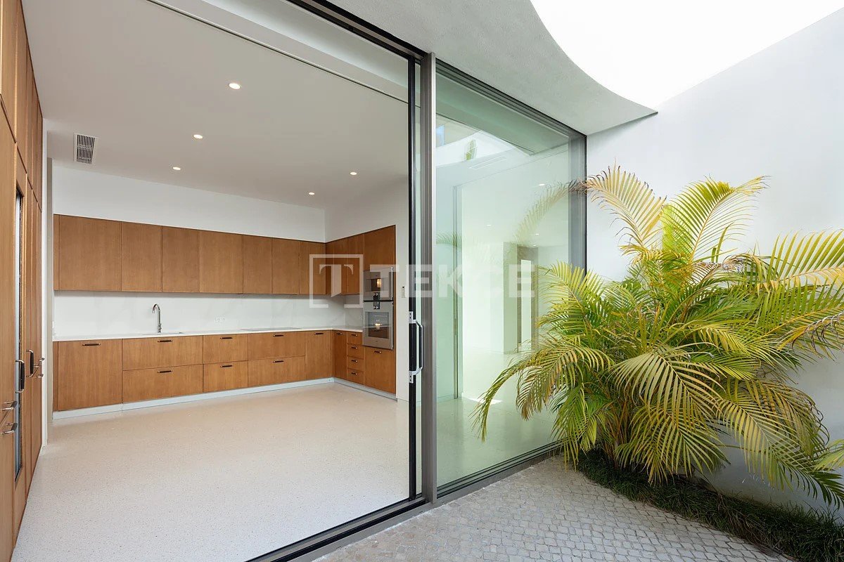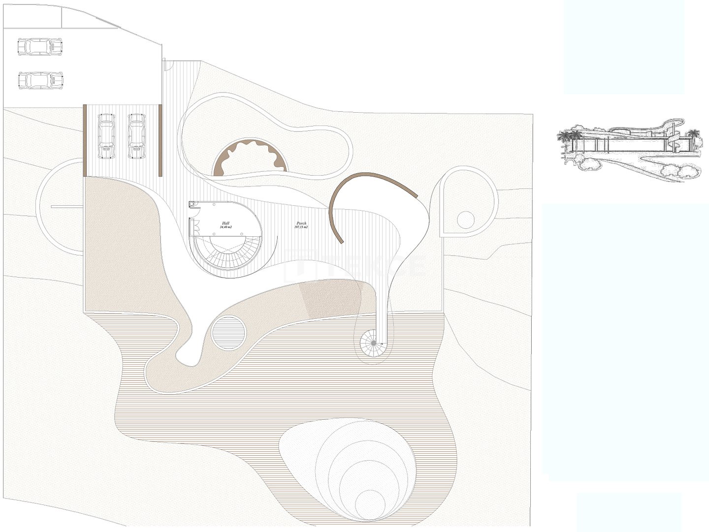 Diese atemberaubende, schlüsselfertige Villa verfügt über 552 qm bebaute Fläche und 457 qm Terrassen. Dank der übergroßen Fenster und Glasschiebetüren wird der Innenraum von natürlichem Licht durchflutet und verbindet sich nahtlos mit dem Außenbereich. Alle Wohn und Essbereiche befinden sich im Erdgeschoss, während das Obergeschoss als Eingang dient und geschickt als Parkplatz sowie als Bühne für den Empfang von Gästen gestaltet ist. Vom Obergeschoss gelangt man über eine Wendeltreppe direkt in den Garten und zum Poolbereich.
