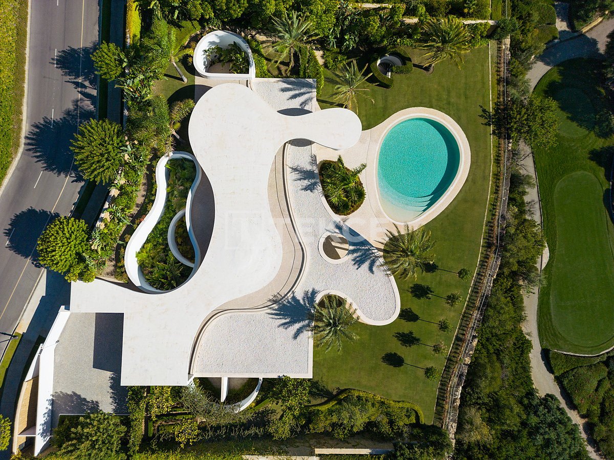 Diese herausragende, nach Westen ausgerichtete Villa ist ein Meisterwerk architektonischer Brillanz, das eine perfekte Mischung aus Einzigartigkeit und Raffinesse darstellt. Das von renommierten Architekten entworfene Bauwerk verbindet futuristische Elemente mit nostalgischem Charme und besticht durch seine nahtlose Linienführung und die perfekte Integration in die Umgebung, die eine ausgewogene Koexistenz mit der Natur verkörpert. Diese hochmoderne Villa liegt auf einem großzügigen, 2.340 m² großen Grundstück in erster Reihe zum Golfplatz und bietet weitläufige Außenbereiche mit einem ovalem Pool, der von gepflegten Gärten umgeben ist an.