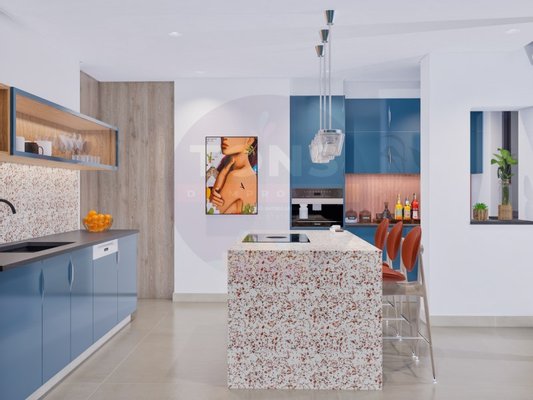 Küche mit Möbeln in hellen Tönen, Silestone- oder Natursteinplatten.
