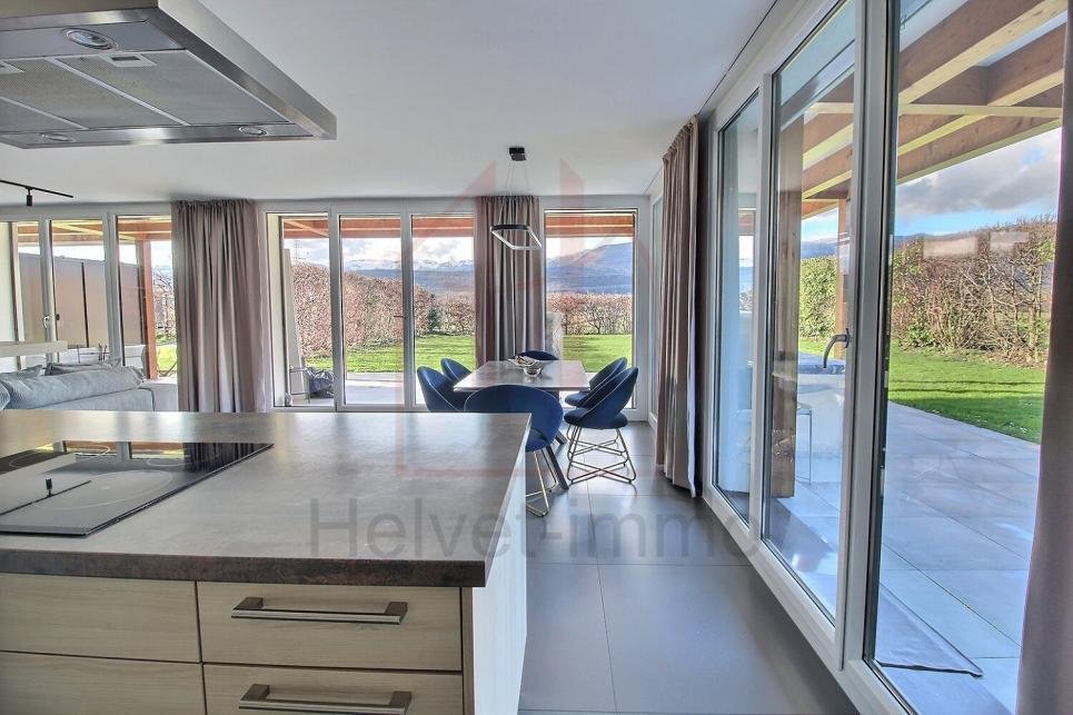 It offers a bright living room, two bedrooms, two bathrooms, as well as a corner terrace and a large garden of more than 400 m² with unobstructed views of the countryside and the Jura.