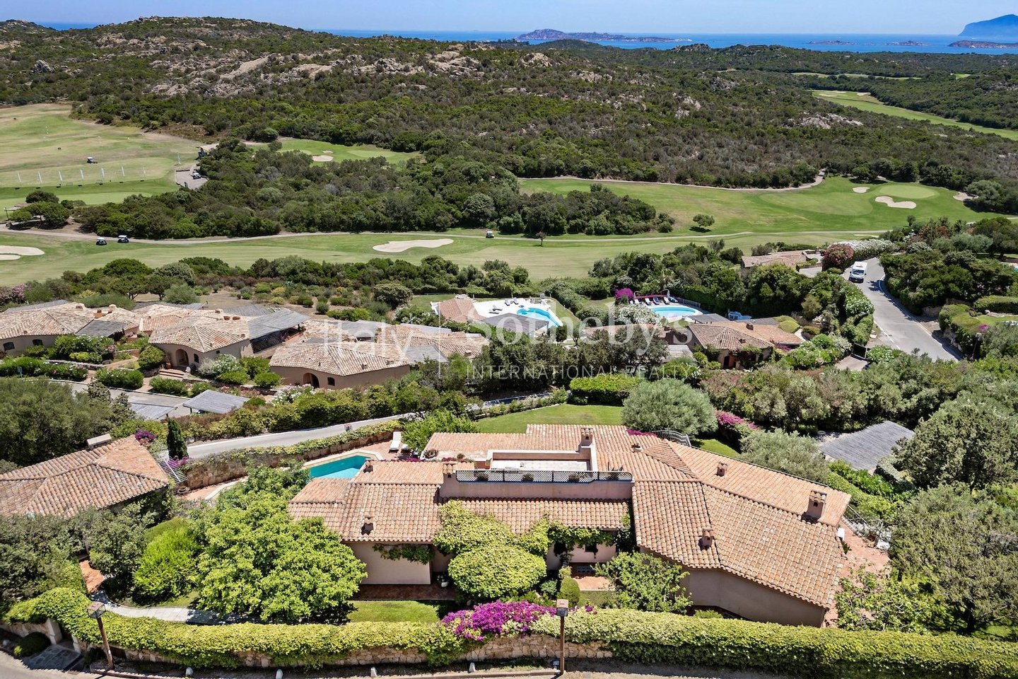 Elegante Panorama-Villa nur wenige Gehminuten vom renommierten Pevero Golf Club entfernt. Diese großzügige Residenz mit acht Schlafzimmern bietet einen atemberaubenden Blick auf den Golfplatz und das umliegende Meer und schafft so ein anspruchsvolles