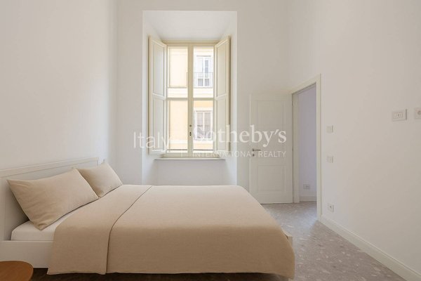 In the historic center of Rome, between Piazza di Spagna, the Trevi Fountain and the Pantheon, an exclusive one-bedroom apartment on the fourth floor of the prestigious Palazzo Raggi-an elegant 18th-century building restored to its original splendor through a major renovation supervised by the Superintendency.