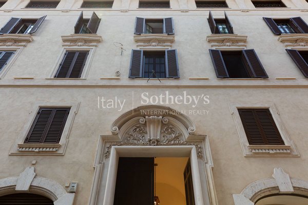 In the historic center of Rome, between Piazza di Spagna, the Trevi Fountain and the Pantheon, an exclusive one-bedroom apartment on the fourth floor of the prestigious Palazzo Raggi-an elegant 18th-century building restored to its original splendor