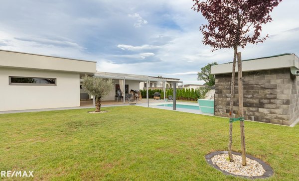 In herrlich ruhiger Lage präsentiert sich dieser exklusive Bungalow aus dem Jahr 2020 als echtes Wohnjuwel für höchste Ansprüche. Auf einem großzügigen Grundstück errichtet, besticht das Objekt durch seine massive Bauweise mit 50 cm starkem Ziegelmauerwerk (Innenwände 25 cm), klare architektonische Linienführung sowie eine angenehm hohe Raumhöhe von ca. 2,85 m – ein Garant für luftiges, großzügiges Wohngefühl auf einer Ebene.