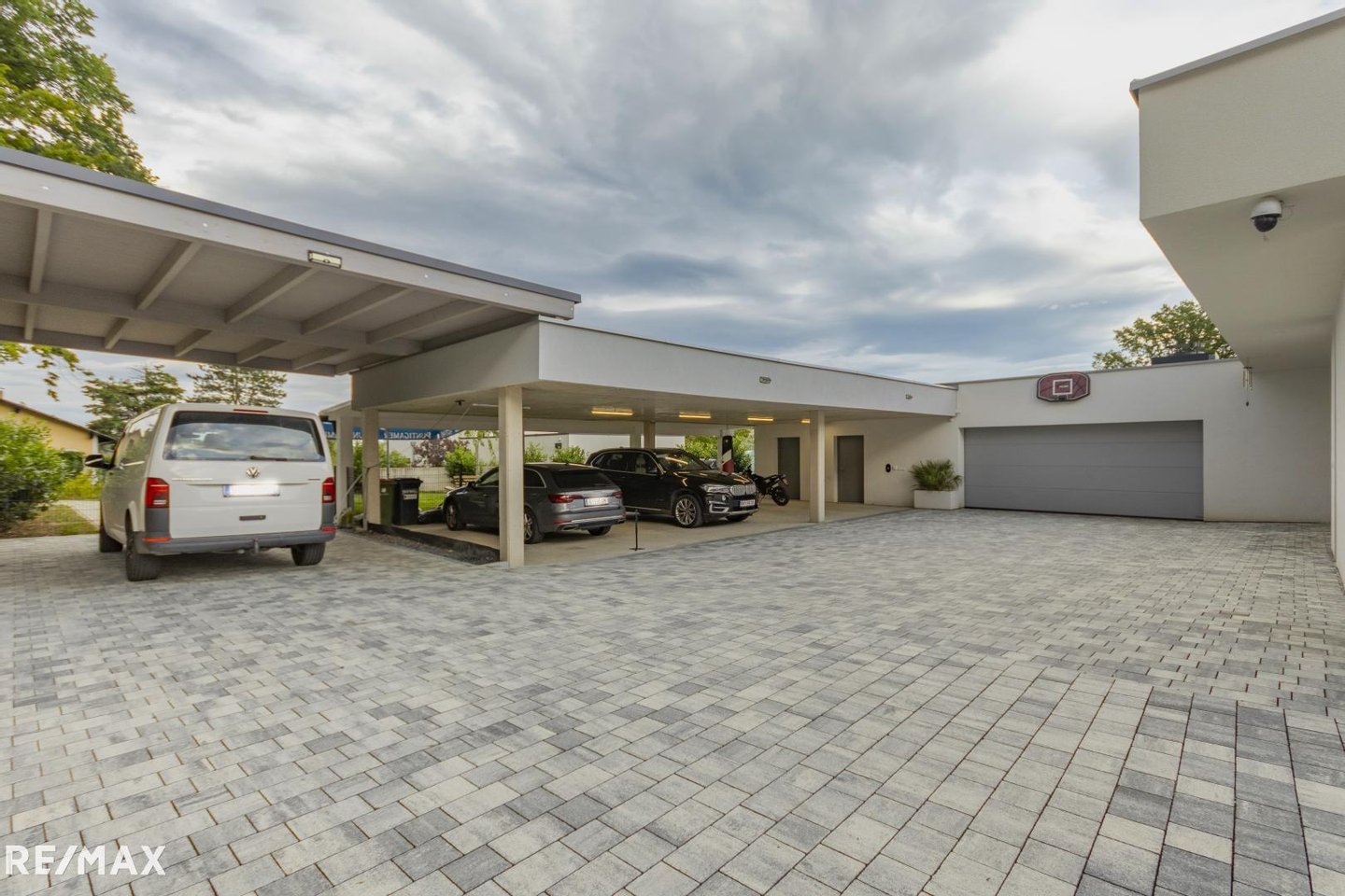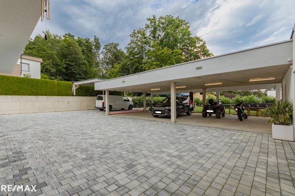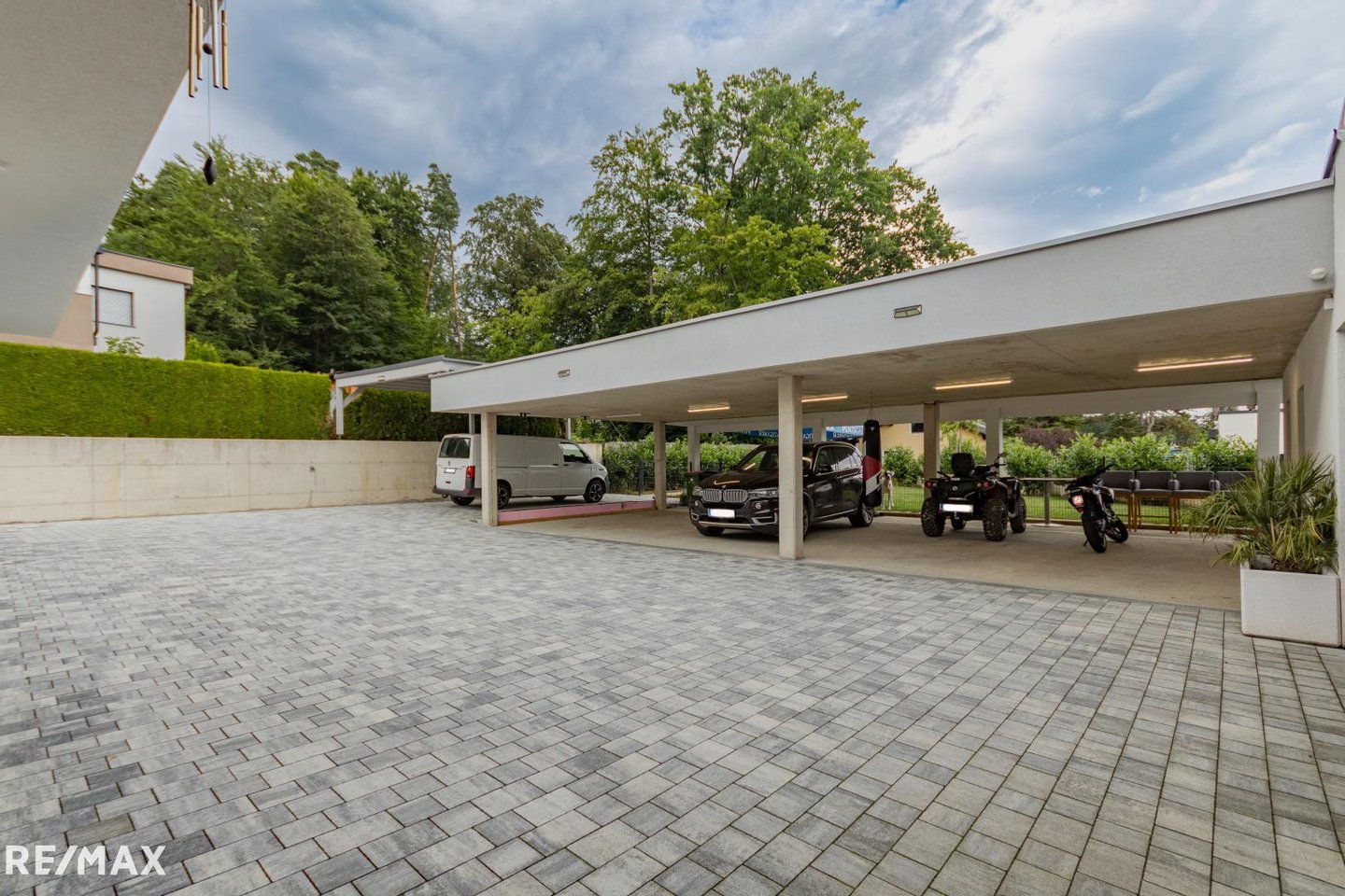 Abgerundet wird das Angebot durch eine Doppelgarage mit direktem Hauszugang sowie fünf zusätzliche Carports, die ausreichend Platz für Fahrzeuge bieten – ideal auch für Gäste oder eine Mehrgenerationennutzung. Die Lage des Bungalows bietet nicht nur Ruhe und Privatsphäre, sondern auch eine ausgezeichnete Anbindung an Infrastruktur wie Einkaufsmöglichkeiten, Schulen, öffentliche Verkehrsmittel sowie die Nähe zu städtischen Zentren wie Graz.