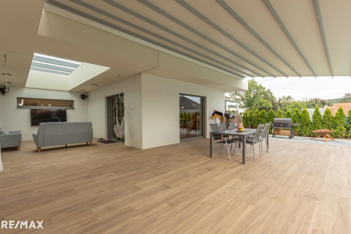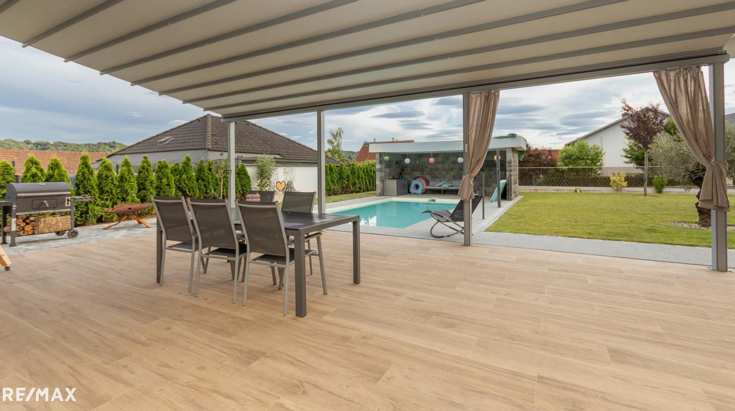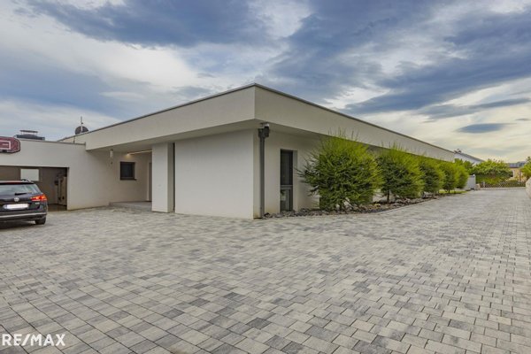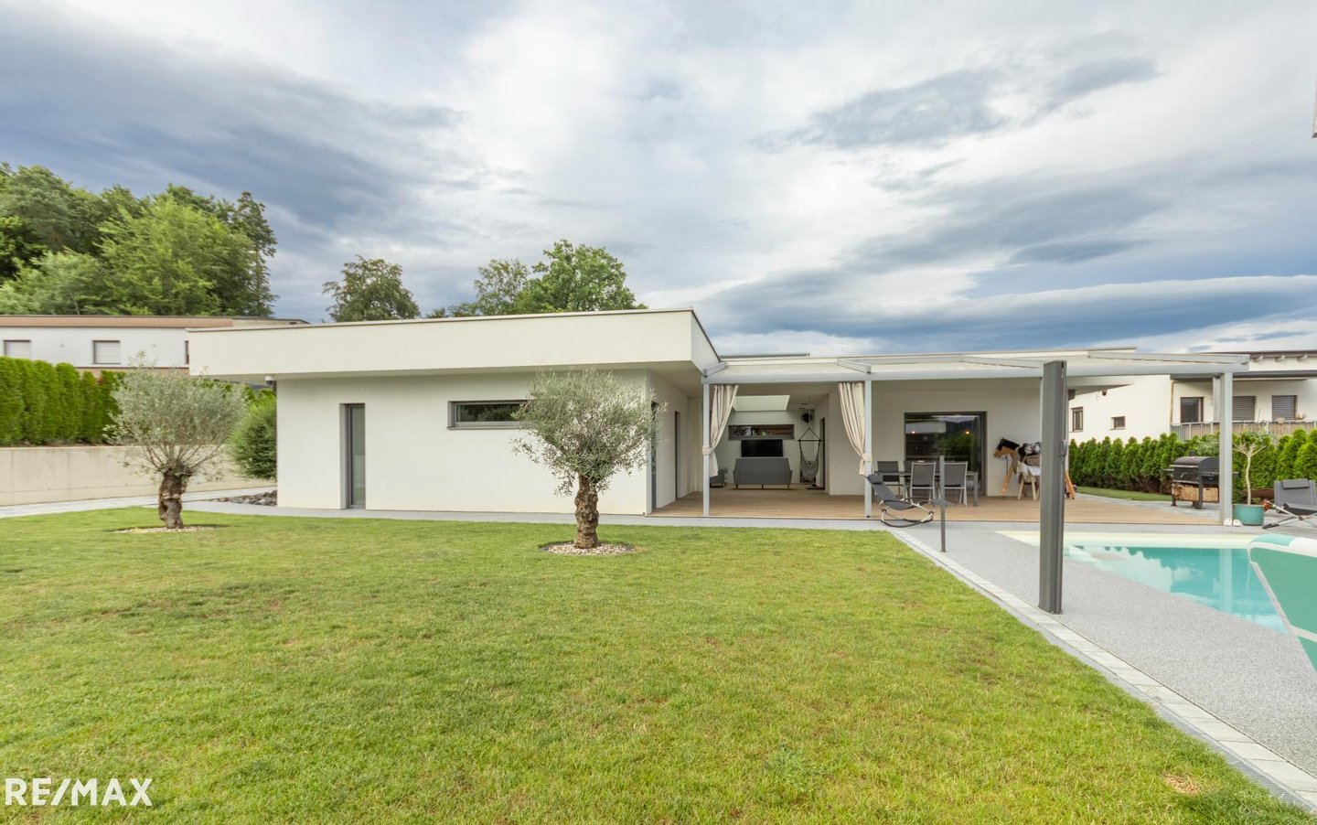 Abgerundet wird das Angebot durch eine Doppelgarage mit direktem Hauszugang sowie fünf zusätzliche Carports, die ausreichend Platz für Fahrzeuge bieten – ideal auch für Gäste oder eine Mehrgenerationennutzung. Die Lage des Bungalows bietet nicht nur Ruhe und Privatsphäre, sondern auch eine ausgezeichnete Anbindung an Infrastruktur wie Einkaufsmöglichkeiten, Schulen, öffentliche Verkehrsmittel sowie die Nähe zu städtischen Zentren wie Graz.