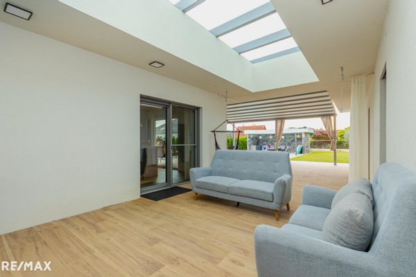 Der Bungalow befindet sich in neuwertigem Zustand und bietet durch seine durchdachte Planung und konsequent hochwertige Ausführung ein Zuhause mit unvergleichlichem Komfort. Fenster der Premium-Marke INTERNORM wurden flächenbündig eingebaut und harmonieren perfekt mit den ebenso flächenbündigen, eleganten Eichentüren von DAN, ausgestattet mit Soft-Close-Funktion. Zwei voll ausgestattete Designküchen der Marke DAN lassen auch kulinarisch keine Wünsche offen.