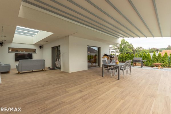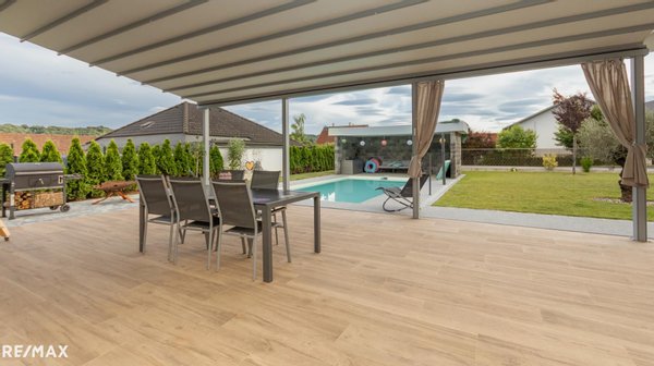 Im Außenbereich lädt eine beeindruckende, ca. 110 m² große Terrasse mit Pool zum Entspannen und Genießen ein. Ein echtes Highlight für warme Sommertage!