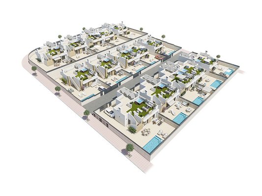 Die Häuser werden in hervorragender Qualität erbaut und bieten Wärmedämmung und Schallschutz entsprechend der neuesten Bauvorschriften, Fenster mit Doppelverglasung und elektrischen Rollläden, Klimaanlage, Innen- und Außenbeleuchtung, Badezimmer mit Porzellanelementen, Möbeln und Glasduschtrennwänden, Einbauschränke in den Schlafzimmern, Einbauküchen mit Dunstabzugshauben und vieles mehr. Darüber hinaus gehören zu jeder Wohneinheit ein privater Kfz-Stellplatz und ein Privatpool.
