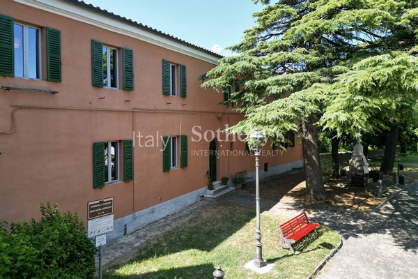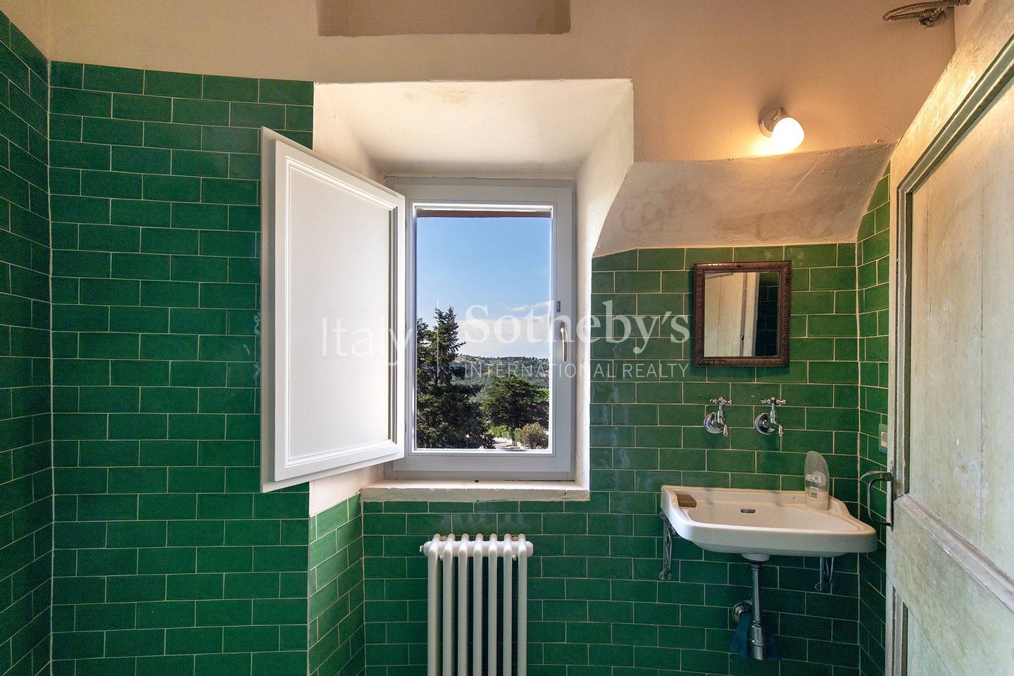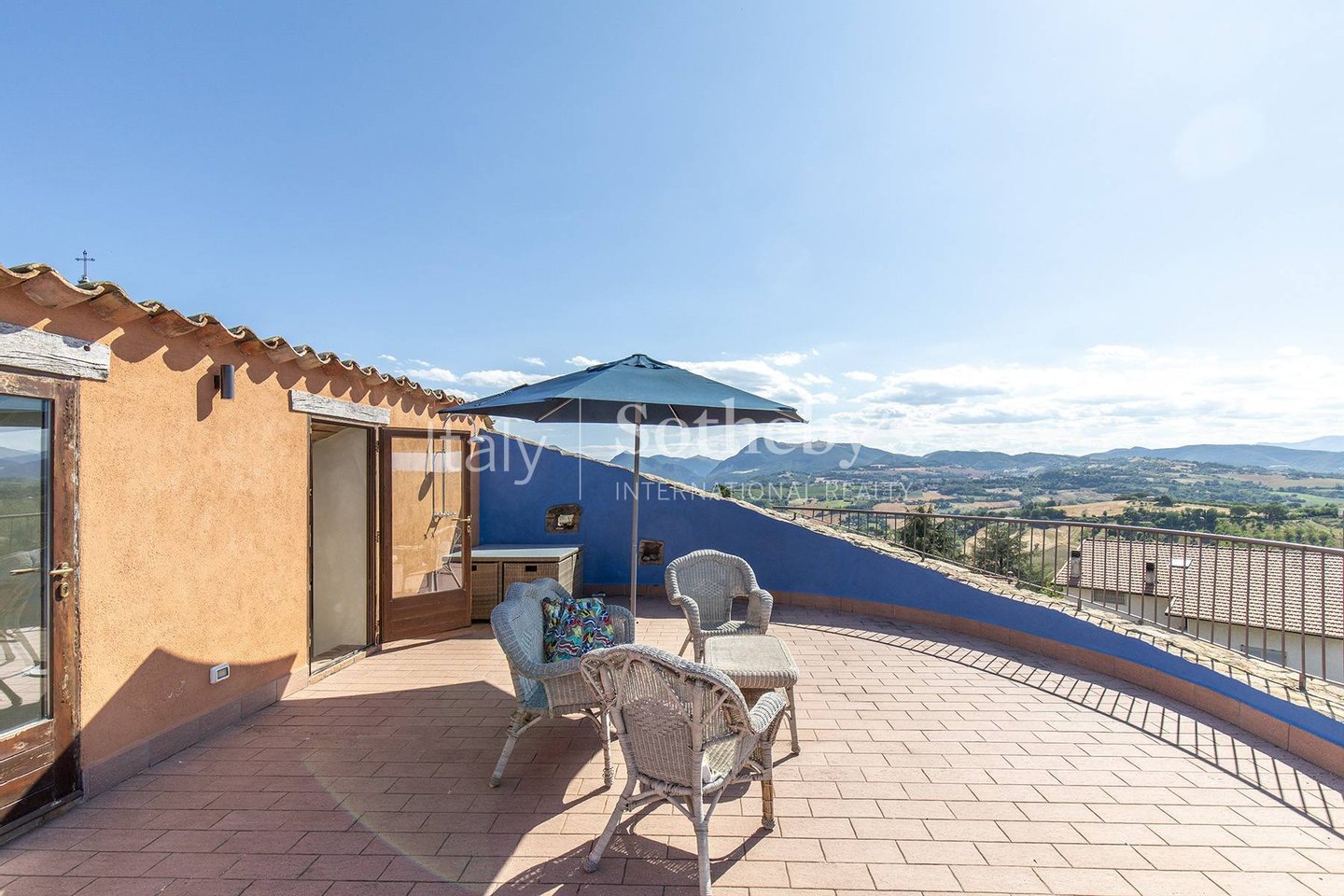 Im ersten Stock befinden sich ein lichtdurchflutetes Wohnzimmer mit Galerie, ein Arbeitszimmer und drei Doppelzimmer, jeweils mit eigenem Bad. Im zweiten Stock führt eine kleine Küche zu einer herrlichen Panoramaterrasse von 40 m² mit Blick, der sich von den Apenninen bis zur Adria erstreckt.