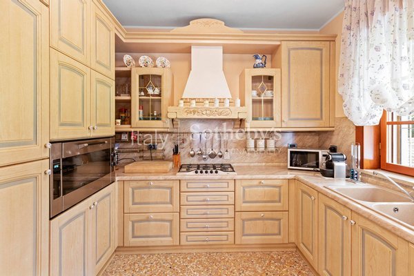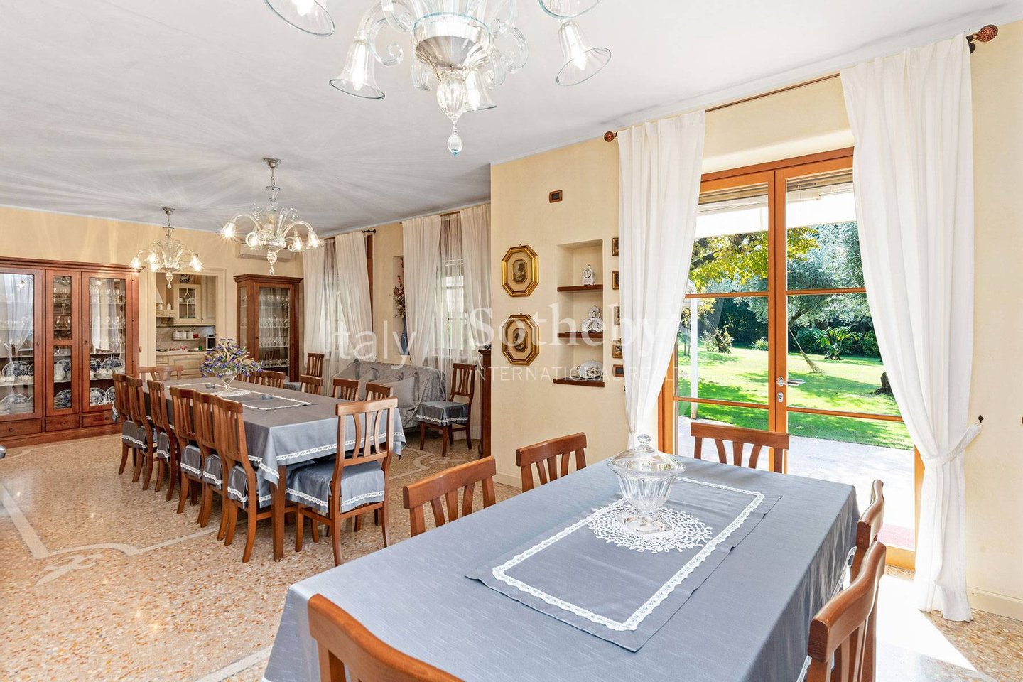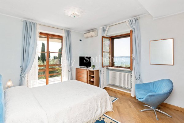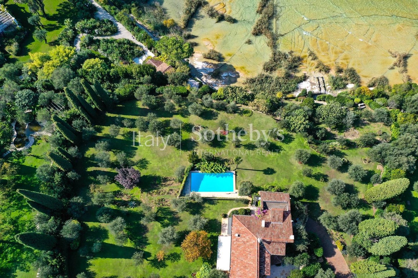 Eingebettet in einen etwa 4.000 m² großen Privatpark mit jahrhundertealten Olivenbäumen und mediterranen Pflanzen, verfügt die Immobilie über einen Pool mit Blick auf den See, an einem der Punkte, an denen das Wasser in kristallklarem Blau erstrahlt.