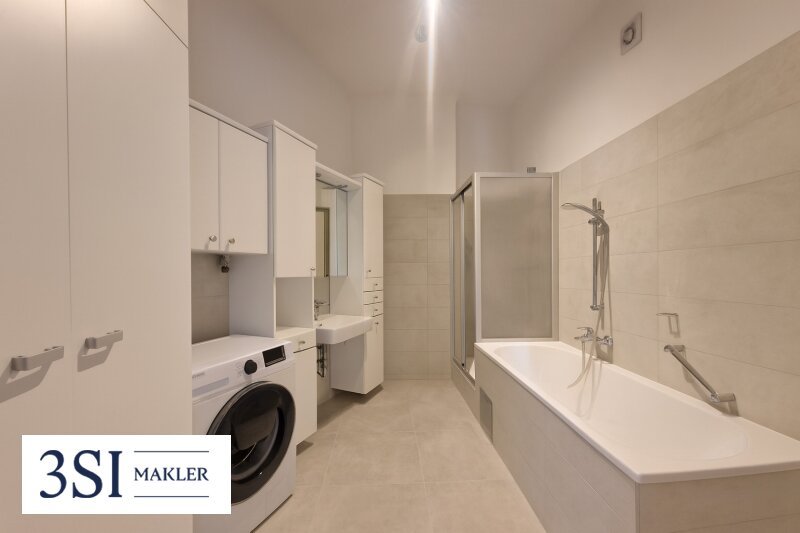 Das modern ausgestattete Badezimmer ist sowohl mit einer Badewanne als auch mit einer Dusche ausgestattet und bietet somit weiteren Komfort. Die geräumige Küche ist im großzügigen Vorraum integriert und schafft mit ihrem funktionalen Schnitt und der Helligkeit einen angenehmen Mittelpunkt für den Alltag.
