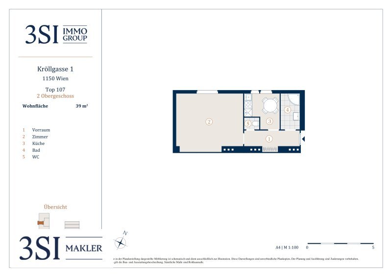Die Wohnfläche von rund 39 m² überzeugt durch einen effizienten und gut durchdachten Grundriss, der sowohl Funktionalität als auch Wohnkomfort bietet. Die Raumaufteilung gestaltet sich wie folgt: