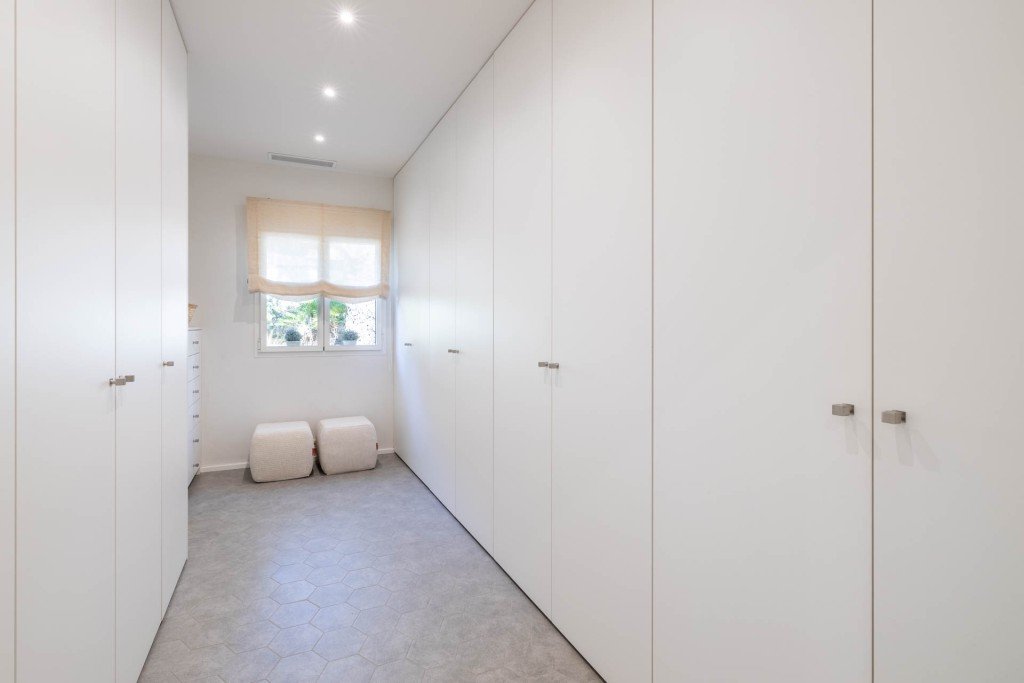 Das Haus befindet sich inmitten eines Gartens mit Bäumen und einheimischen Pflanzen. Wir betreten das Haus durch eine Eingangshalle, die mit dem Wohn-/Esszimmer mit offener Küche verbunden ist und beide mit der überdachten Terrasse verbindet. Von der Eingangshalle auf der rechten Seite finden wir drei Schlafzimmer (plus ein weiteres Zimmer, das derzeit als Ankleidezimmer genutzt wird) und zwei Bäder (eines davon en suite). Das Haus ist sehr hell und man kann von fast jedem Zimmer aus das Meer sehen.