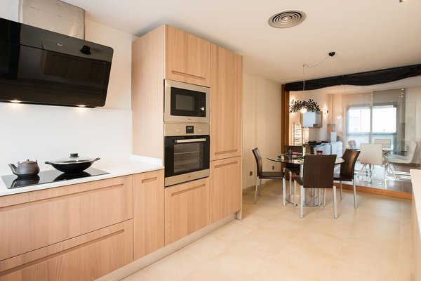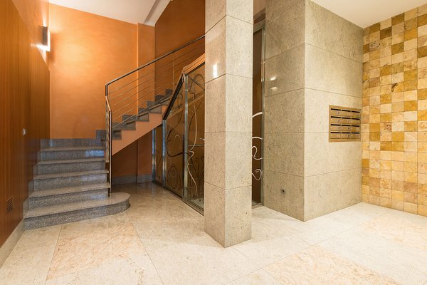 Zur hochwertigen Ausstattung zählen ein durchgehender Parkettboden, individuell angefertigte Einbauschränke sowie Innentischlerarbeiten aus Kirschholz. Für ein angenehmes Raumklima sorgen eine zentrale Klimaanlage sowie isolierende Fenster mit Aluminiumrahmen und Dreifachverglasung, die zudem einen effektiven Schallschutz bieten.