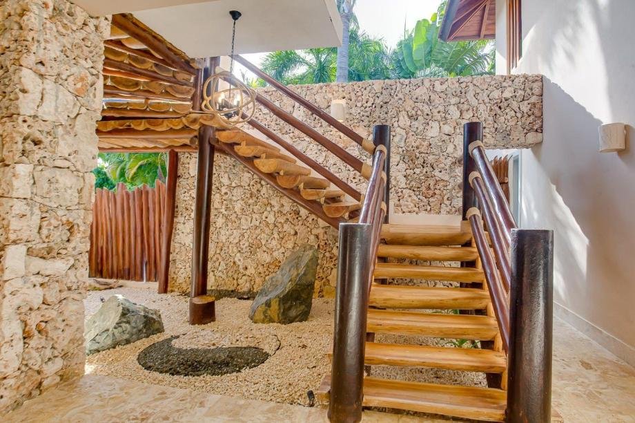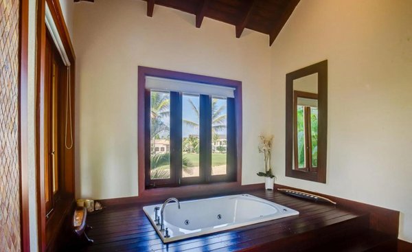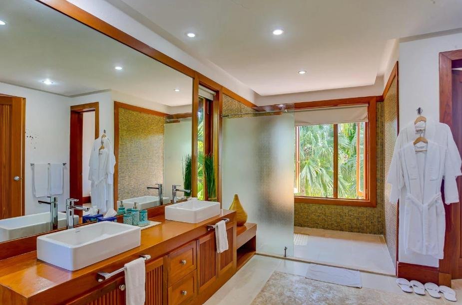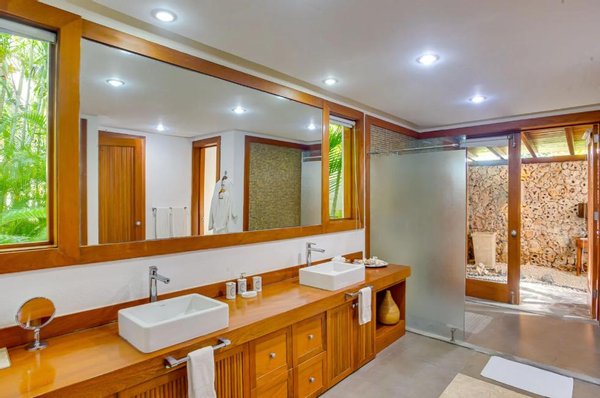 Die Oberflächen umfassen Hartholz, Marmor und moderne architektonische Details, die das natürliche Licht und die Verbindung zur tropischen Umgebung verbessern.